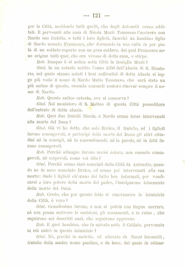 per la Città, uccidendo tutti quelli, che dagli Àntonelli erano additati. E pervenuti alla casa di Nicola Muzii Tommaso l'uccisero con Nardo suo fratello, e tutti i loro figlioli, fuorché un bambino figlio di Nardo nomato Francesco, che dormendo in una culla fu per pietà di un soldato coperto con un gran caldaro, dal qual Francesco anno origine tutti quei, che ora vivono di detta casa, e stirpe.