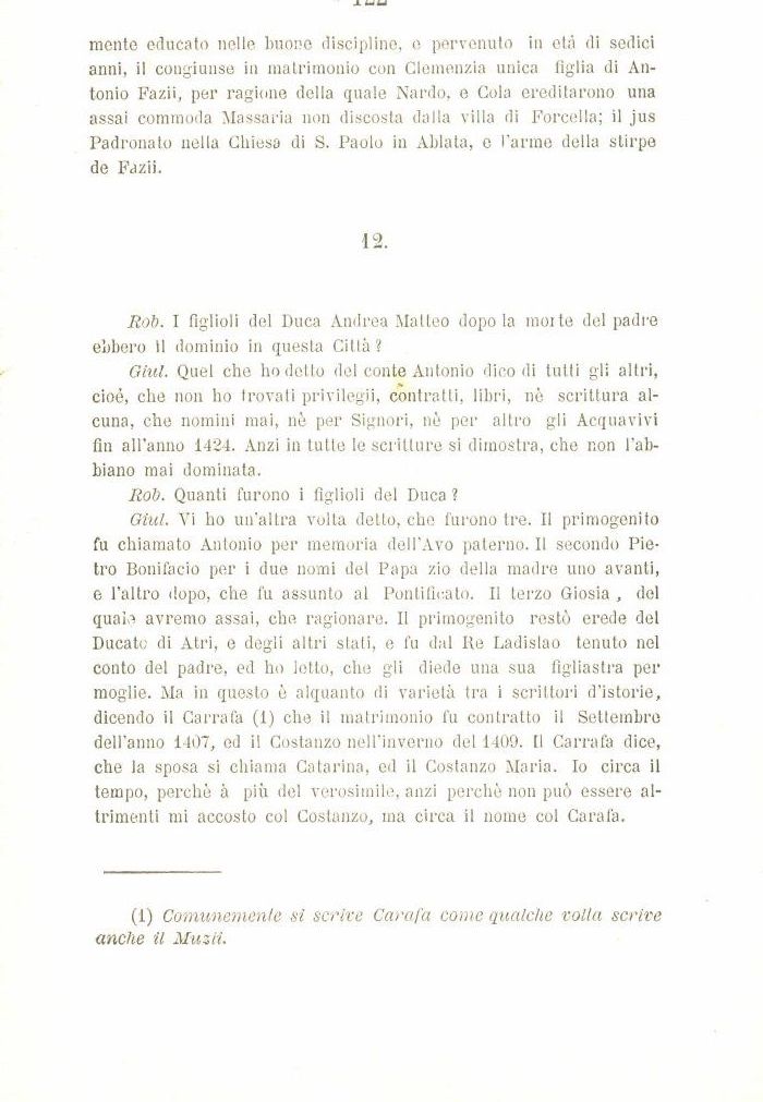 Oiul. Vi ho un'altra volta detto, che furono tre. Il primogenito fu chiamato Antonio per memoria dell'Avo paterno. Il secondo Pietro Bonifacio per i due nomi del Papa zio della madre uno avanti, e l'altro dopo, che fu assunto al Pontificato. Il terzo Giosia , del quale avremo assai, che ragionare. Il primogenito restò erede del Ducato di Atri, e degli altri stati, e fu dal Re Ladislao tenuto nel conto del padre, ed ho ietto, che gli diede una sua figliastra per moglie. Ma in questo è alquanto di varietà tra i scrittori d'istorie, dicendo il Carrata (1) che il matrimonio fu contratto il Settembre dell'anno 1407, ed il Costanzo nell'inverno del 1409. 11 Carraia dice, che la sposa si chiama Catarina, ed il Costanzo Maria. Io circa il tempo, perchè à più del verosimile, anzi perchè non può essere altrimenti mi accosto col Costanzo, ma circa il nome col Carafa.