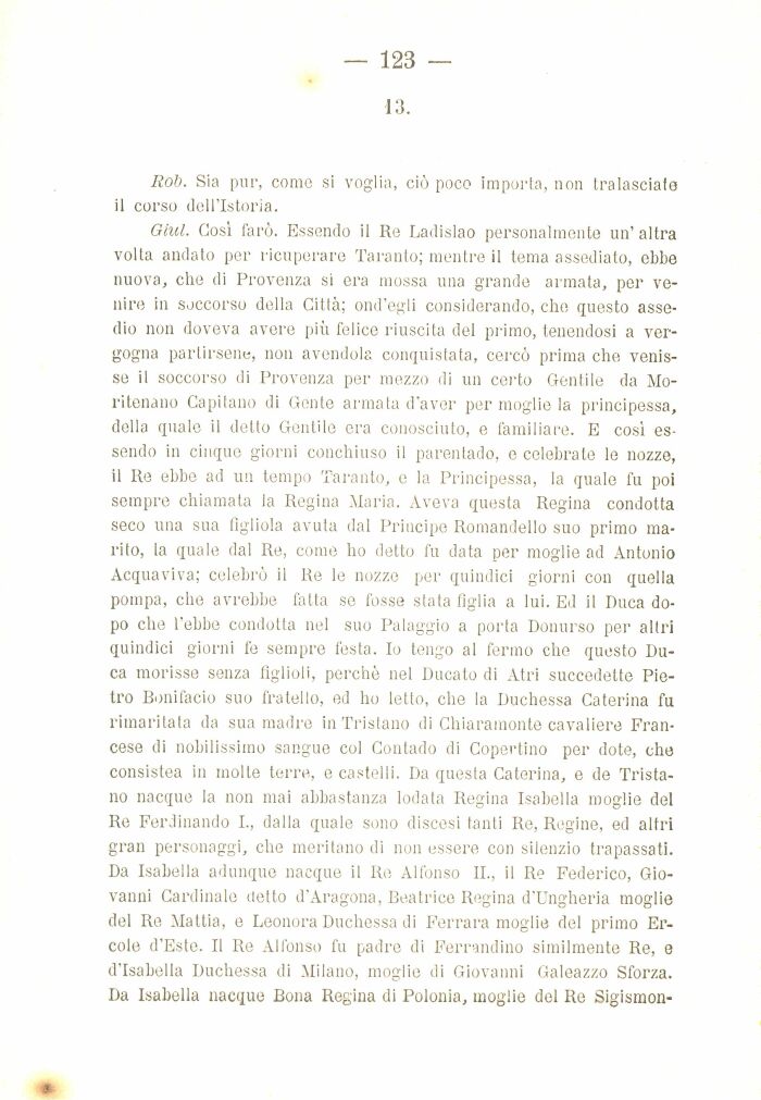 Giul. Così farò. Essendo il Re Ladislao personalmente un' altra volta andato per ricuperare Taranto; mentre il tema assediato, ebbe nuova, che di Provenza si era mossa una grande armata, per venire in soccorso della Città; ond'egli considerando, che questo assedio non doveva avere più felice riuscita del primo, tenendosi a vergogna partirsene, non avendola conquistata, cercò prima che venisse il soccorso di Provenza per mezzo di un certo Gentile da Mo-ritenano Capitano di Gente armata d'aver per moglie la principessa, della quale il detlo Gentile era conosciuto, e familiare. E cosi essendo in cinque giorni conchiuso il parentado, e celebrate le nozze, il Re ebbe ad un tempo Taranto, e la Principessa, la quale fu poi sempre chiamata la Regina Maria. Aveva questa Regina condotta seco una sua figliola avuta dal Principe Romandello suo primo marito, la quale dal Re, come ho detto fu data per moglie ad Antonio Acquaviva; celebrò il Re le nozze per quindici giorni con quella pompa, che avrebbe fatta se fosse stata figlia a lui. Ed il Duca dopo che l'ebbe condotta nel suo Palaggio a porta Donurso per altri quindici giorni fe sempre festa. Io tengo al fermo che questo Duca morisse senza figlioli, perchè nel Ducato di Atri succedette Pietro Bonifacio suo fratello, ed ho letto, che la Duchessa Caterina fu rimaritata da sua madre in Tristano di Chiaramonte cavaliere Francese di nobilissimo sangue col Contado di Copertino per dote, che consistea in molte terre, e castelli. Da questa Caterina, e de Tristano nacque la non mai abbastanza lodata Regina Isabella moglie del Re Ferdinando I., dalla quale sono discesi tanti Re, Regine, ed altri gran personaggi, che meritano di non essere con silenzio trapassati. Da Isabella adunque nacque il Re Alfonso II., il Re Federico, Giovanni Cardinale detto d'Aragona, Beatrice Regina d'Ungheria moglie del Re Mattia, e Leonora Duchessa di Ferrara moglie del primo Ercole d'Este. Il Re Alfonso fu padre di Ferrandino similmente Re, e d'Isabella Duchessa di Milano, moglie di Giovanni Galeazzo Sforza. Da Isabella nacque Bona Regina di Polonia, moglie del Re Sigismon-