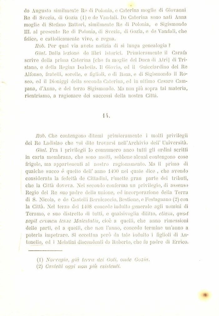Giul. Fra i privilegii Io connumero anco tutti gli ordini scritti in carta membrana, che sono molti, sebbene alcuni contengono cose frigoie, ma appartenenti al nostro ragionamento. Ma il primo di qualche succo é quello dell' anno 1400 nel quale dice , che avendo considerata la fedeltà de Cittadini, rimette gran parte dei tributi, che la Città doveva. Nel secondo conferma un privilegio, di assenso Regio del Re .suo padre della unione, ed incorporazione della Terra di S. Nicola, e de Castelli Bernicaccio, Bestione, e Festagnano (2) con la Città. Nel terzo del 1408 concede indulto generale agli uomini di Teramo, e suo distretto di lutti, e qualsivoglia dilitto, etiam, quod sapit crimen lesae Maiestatis, cioè a quelli, che anno rimessioni delle parti, ed a quelli, che non l'anno, concede termine un'anno a poterla impetrare. Si eccettua però da tale indulto i figlioli di Antonello, ed i Melatini discendenti da Roberto, che fu padre di Errico.