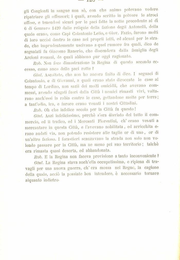 Giul. Ascoltate, che non ho ancora finito di dire. I seguaci di Colantonio, e di Giovanni, a quali erano state diroccate le case al tempo di Lordino, non sazii dei molti omicidii, che avevano commessi, avendo sfugati fuori dalla Città i nemici rimasti vivi, volta-rano anch'essi la rabia contro le case, gettandone molte per terra; a tant'odio, ira, e furore erano venuti i nostri Cittadini.