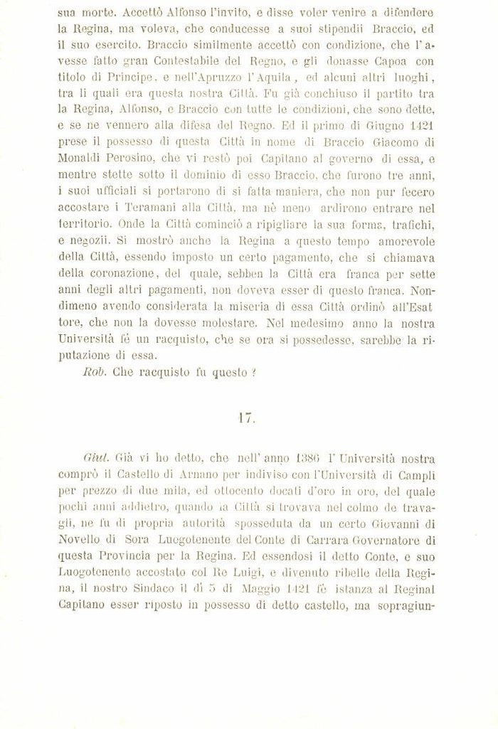 sua morte. Accettò Alfonso l'invito, e disse voler venire a difendere la Regina, ma voleva, che conducesse a suoi stipendii Braccio, ed il suo esercito. Braccio similmente accettò con condizione, che l'avesse fatto gran Contestabile del Regno, e gli donasse Capoa con titolo di Principe, e nell'Apruzzo l'Aquila, ed alcuni altri luoghi, tra li quali era questa nostra Città. Fu già conchiuso il partito tra la Regina, Alfonso, e Braccio con tutte le condizioni, che sono dette, e se ne vennero alla difesa del Regno. Ed il primo di Giugno 1421 prese il possesso di questa Città in nome di Braccio Giacomo di Monaldi Perosino, che vi restò poi Capitano al governo di essa, e mentre stette sotto il dominio di esso Braccio, che furono tre anni, i suoi ufficiali si portarono di si fatta maniera, che non pur fecero accostare i Teramani alla Città, ma nò meno ardirono entrare nel territorio. Onde la Città cominciò a ripigliare la sua forma, trafichi, e negozii. Si mostrò anche la Regina a questo tempo amorevole della Città, essendo imposto un certo pagamento, che si chiamava della coronazione, del quale, sebben la Città era franca per sette anni degli altri pagamenti, non doveva esser di questo franca. Nondimeno avendo considerata la miseria di essa Città ordinò all'Esat tore, che non la dovesse molestare. Nel medesimo anno la nostra Università fé un racquisto, che se ora si possedesse, sarebbe la riputazione di essa.