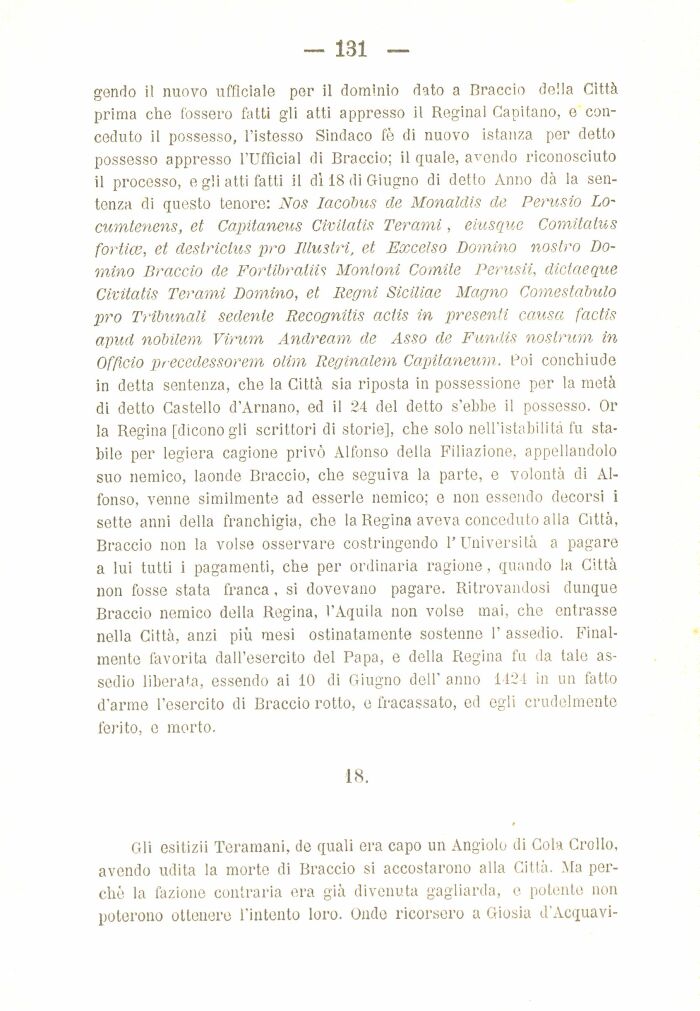 gendo il nuovo ufficiale per il dominio dato a Braccio della Città prima che fossero fatti gli atti appresso il Regina! Capitano, e conceduto il possesso, l'istesso Sindaco fè di nuovo istanza per detto possesso appresso l'Ufficiai di Braccio; il quale, adendo riconosciuto il processo, e gli atti fatti il dì 18 di Giugno di detto Anno dà la sentenza di questo tenore: Nos Iacòbus de Monaldis de Perusio Lo-cumtenens, et Capitaneus Civilatis Teramì, eiusque Comitcìtus fortice, et destricius prò Illustri, et Excelso Domino nostro Domino Braccio de FortibratiU Montoni Cornile Perusii, dictaeque Civitatis Terami Domino, et Regni Siciliae Magno Comestaìmlo prò Tribunali sedente Recognitis actis in presenti causa factis apud nobilem Virum Andream de Asso de Fundis nostrum in Officio precedessorem olim Reginalem Capitaneum. Poi conchiude in detta sentenza, che la Città sia riposta in possessione per la metà di detto Castello d'Amano, ed il 24 del detto s'ebbe il possesso. Or la Regina [dicono gli scrittori di storie], che solo nell'istabilità fu stabile per legiera cagione privò Alfonso della Filiazione, appellandolo suo nemico, laonde Braccio, che seguiva la parte, e volontà di Alfonso, venne similmente ad esserle nemico; e non essendo decorsi i sette anni della franchigia, che la Regina aveva conceduto alla Città, Braccio non la volse osservare costringendo l'Università a pagare a lui tutti i pagamenti, che per ordinaria ragione, quando la Città non fosse stata franca , si dovevano pagare. Ritrovandosi dunque Braccio nemico della Regina, l'Aquila non volse mai, che entrasse nella Città, anzi più mesi ostinatamente sostenne 1' assedio. Finalmente favorita dall'esercito del Papa, e della Regina fu da tale assedio liberata, essendo ai 10 di Giugno dell' anno 1424 in un fatto d'arme l'esercito di Braccio rotto, e fracassato, ed egli crudelmente ferito, e morto.