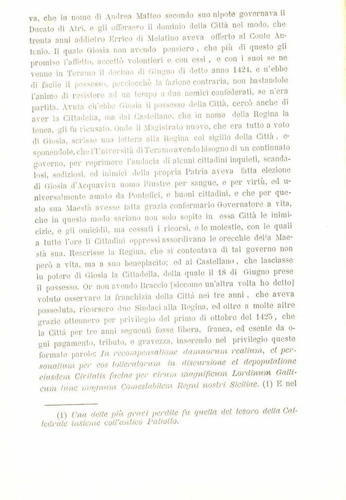 va, che in nome di Andrea Matteo secondo suo nipote governava il Ducato di Atri, e gli offersero il dominio della Città nel modo, che trenta anni addietro Errico di Melatino aveva offerto al Conte Antonio. Il quale Giosia non avendo pensiero , che più di questo gli promise l'affetto, accettò volontieri e con essi , e con i suoi se ne venne in Teramo il decimo di Giugno di detto anno 1424, e n'ebbe di facile il possesso, perciocché la fazione contraria, non bastandole l'animo di resistere ad un tempo a due nemici confederati, se n'era partita. Avuta ch'ebbe Giosia il possesso della Città, cercò anche di aver la Cittadella, ma dal Castellano, che in nome della Regina la tenea, gli fu ricusato. Onde il Magistrato nuovo, che era tutto a voto di Giosia, scrisse una lettera alla Regina col sigillo della Città , e-sponendole, che l'Università di Teramo avendo bisogno di un continuato governo, per reprimere l'audacia di alcuni cittadini inquieti, scandalosi, sediziosi, ed inimici della propria Patria aveva fatta elezione di Giosia d'Acquaviva uomo illustre per sangue, e per virtù, ed u-niversalmente amato da Pontefici, e buoni cittadini, e che per questo sua Maestà avesse latta grazia confermarlo Governatore a vita, che in questo modo sariano non solo sopite in essa Città le inimicizie, e gli omicidii, ma cessati i ricorsi, e le molestie, con le quali a tutte l'ore li Cittadini oppressi assordivano le orecchie della Maestà sua. Rescrisse la Regina, che si contentava di tal governo non però a vita, ma a suo beneplacito; ed al Castellano, che lasciasse in potere di Giosia la Cittadella, della quale il 18 di Giugno prese il possesso. Or non avendo Braccio [siccome un'altra volta ho detto] voluto osservare la franchizia della Citlà nei tre anni , che aveva posseduta, ricorsero due Sindaci alla Regina, ed oltre a molte altre grazie ottennero per privilegio del primo di ottobre del 1425, che la Città per tre anni seguenti fosse libera, franca, ed esente da o-gni pagamento, tributo, e gravezza, inserendo nel privilegio queste formate parole: In recompensa/ione damnorum realium, et per-sonalium per eos lolleratorum in discursione et depopulatione eiusdem Civilatis faclae per virum magnificimi Lordinum Galli-cimi lune magnum Comestabilem Regni nostri Siciliae. (1) E nel