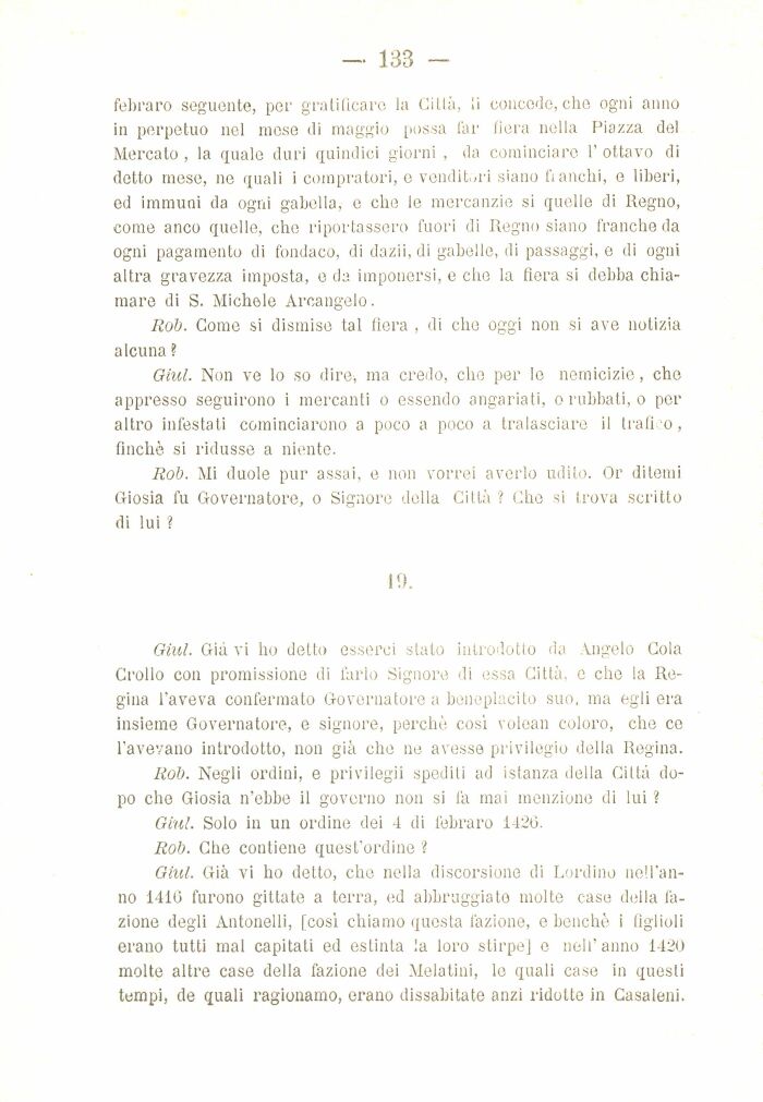 Qiul. Già vi ho detto esserci sialo introdotto da Angelo Cola Crollo con promissione di farlo Signore di essa Città, e che la Regina l'aveva confermato Governatore a beneplacito suo, ma egli era insieme Governatore, e signore, perchè cosi volean coloro, che ce l'avevano introdotto, non già che ne avesse privilegio della Regina.