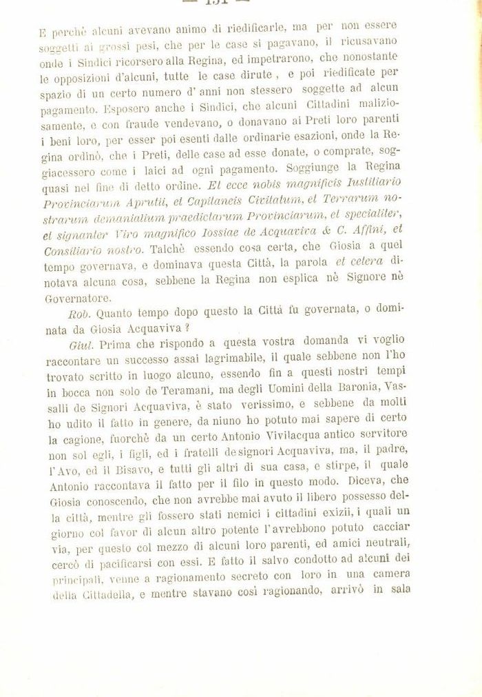 Giul. Prima che rispondo a questa vostra domanda vi voglio raccontare un successo assai lagrimabile, il quale sebbene non l'ho trovato scritto in luogo alcuno, essendo fin a questi nostri tempi in bocca non solo de Teramani, ma degli Uomini della Baronia, Vassalli de Signori Acquaviva, è stato verissimo, e sebbene da molti ho udito il fatto in genere, da niuno ho potuto mai sapere di certo la cagione, fuorché da un certo Antonio Vivilacqua antico servitore non sol egli, i figli, ed i fratelli de signori Acquaviva, ma, il padre, l'Avo, ed il Bisavo, e tutti gli altri di sua casa, e stirpe, il quale Antonio raccontava il fatto per il filo in questo modo. Diceva, che Giosia conoscendo, che non avrebbe mai avuto il libero possesso della città, mentre gli fossero stati nemici i cittadini exizii, i quali un giorno col favor di alcun altro potente l'avrebbono potuto cacciar via, per questo col mezzo di alcuni loro parenti, ed amici neutrali, cercò di pacificarsi con essi. E fatto il salvo condotto ad alcuni dei principali, venne a ragionamento secreto con loro in una camera della Cittadella, e mentre stavano così ragionando, arrivò in sala