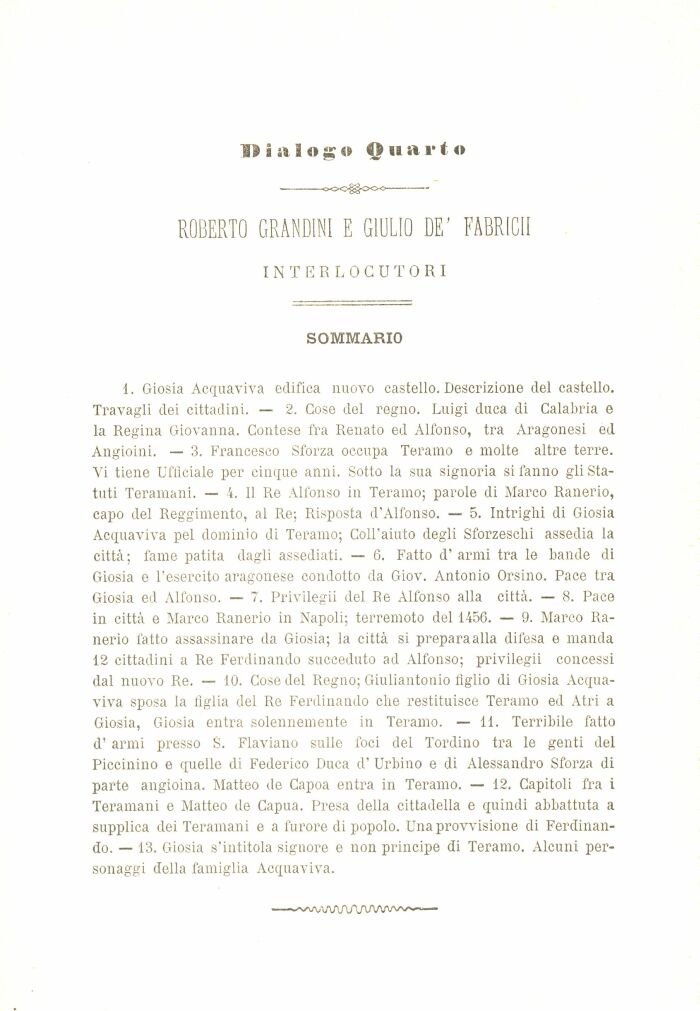 1. Giosia Acquaviva edifica nuovo castello. Descrizione del castello. Travagli dei cittadini. 2. Cose del regno. Luigi duca di Calabria e la Regina Giovanna. Contese fra Renato ed Alfonso, tra Aragonesi ed Angioini. 3. Francesco Sforza occupa Teramo e molte altre terre. Vi tiene Ufficiale per cinque anni. Sotto la sua signoria si l'anno gli Statuti Teramani. 4. Il Re Alfonso in Teramo; parole di Marco Ranerio, capo del Reggimento, al Re; Risposta d'Alfonso. 5. Intrighi di Giosia Acquaviva pel dominio di Teramo; Coll'aiuto degli Sforzeschi assedia la città; fame patita dagli assediati. 6. Fatto d' armi tra le bande di Giosia e l'esercito aragonese condotto da Giov. Antonio Orsino. Pace tra Giosia ed Alfonso. 7. Privilegii del Re Alfonso alla città. 8. Pace in città e Marco Ranerio in Napoli; terremoto del 1456. 9. Marco Ranerio fatto assassinare da Giosia; la città si prepara alla difesa e manda 12 cittadini a Re Ferdinando succeduto ad Alfonso; privilegii concessi dal nuovo Re. 10. Cose del Regno; Giuliantonio figlio di Giosia Acqua-viva sposa la figlia del Re Ferdinando che restituisce Teramo ed Atri a Giosia, Giosia entra solennemente in Teramo. 11. Terribile fatto d' armi presso S. Flaviano sulle foci del Tordino tra le genti del Piccinino e quelle di Federico Duca d' Urbino e di Alessandro Sforza di parte angioina. Matteo de Capoa entra in Teramo. 12. Capitoli fra i Teramani e Matteo de Capua. Presa della cittadella e quindi abbattuta a supplica dei Teramani e a furore di popolo. Una provvisione di Ferdinando. 13. Giosia s'intitola signore e non principe di Teramo. Alcuni personaggi della famiglia Acquaviva.