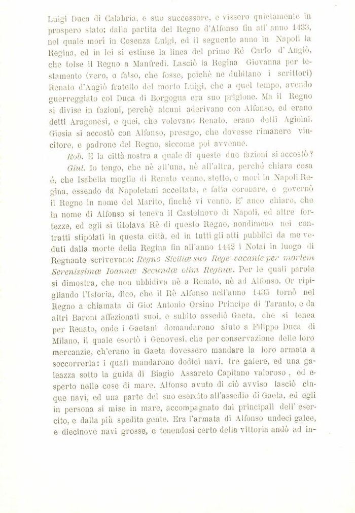 Giul. Io tengo, che né all'una, né all'altra, perché chiara cosa é, che Isabella moglie di Renato venne, stette, e morì in Napoli Regina, essendo da Napoletani accetlata, e fatta coronare, e governò il Regno in nome del Marito, finché vi venne. E' anco chiaro, che in nome di Alfonso si teneva il Castelnovo di Napoli, ed altre fortezze, ed egli si titolava Rè di questo Regno, nondimeno nei contratti stipolati in questa città, ed in tutti gli atti pubblici da me veduti dalla morte della Regina fin all'anno 1442 i Notai in luogo di Regnante scrivevano: Regno Sicilice suo Rege vacante per mortem Serenissimce Ioannce Secunrlce olim Regina'. Per le quali parole si dimostra, che non ubbidiva uè a Renato, nò ad Alfonso. Or ripigliando l'Istoria, dico, che il Rè Alfonso nell'anno 1435 tornò nel Regno a chiamata di Gio: Antonio Orsino Principe di Taranto, e da altri Baroni affezionati suoi, e subito assediò Gaeta, che si tenea per Renato, onde i Gaetani domandarono aiuto a Filippo Duca di Milano, il quale esortò i Genovesi, che per conservazione delle loro mercanzie, ch'erano in Gaeta dovessero mandare la loro armata a soccorrerla: i quali mandarono dodici navi, tre galere, ed una galeazza sotto la guida di Biagio Assareto Capitano valoroso , ed e-sperto nelle cose di mare. Alfonso avuto di ciò avviso lasciò cinque navi, ed una parte del suo esercito all'assedio di Gaeta, ed egli in persona si mise in mare, accompagnato dai principali dell' esercito, e dalla più spedita gente. Era l'armata di Alfonso undeci galee, e diecinove navi grosse, e tenendosi certo della vittoria andò ad in-