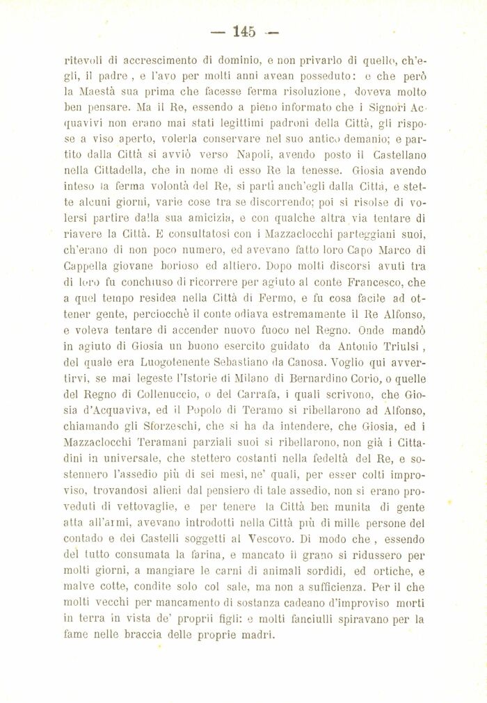 ritevoli di accrescimento di dominio, e non privarlo di quello, ch'egli, il padre, e l'avo per molti anni avean posseduto: e che però la Maestà sua prima che facesse ferma risoluzione, doveva molto ben pensare. Ma il Re, essendo a pieno informato che i Signori Ac-quavivi non erano mai stati legittimi padroni della Città, gli rispose a viso aperto, volerla conservare nel suo antico demanio; e partito dalla Città si avviò verso Napoli, avendo posto il Castellano nella Cittadella, che in nome di esso Re la tenesse. Giosia avendo inteso la ferma volontà del Re, si parti anch'egli dalla Città, e stette alcuni giorni, varie cose tra se discorrendo; poi si risolse di volersi partire dalla sua amicizia, e con qualche altra via tentare di riavere la Città. E consultatosi con i Mazzaclocchi parteggiani suoi, ch'erano di non poco numero, ed avevano fatto loro Capo Marco di Cappella giovane borioso ed altiero. Dopo molti discorsi avuti tra di loro fu conchiuso di ricorrere per agiuto al conte Francesco, che a quel tempo residea nella Città di Fermo, e fu cosa facile ad ottener gente, perciocché il conte odiava estremamente il Re Alfonso, e voleva tentare di accender nuovo fuoco nel Regno. Onde mandò in agiuto di Giosia un buono esercito guidato da Antonio Triulsi , del quale era Luogotenente Sebastiano da Canosa. Voglio qui avvertirvi, se mai legeste l'Istorie di Milano di Bernardino Corio, o quelle del Regno di Collenuccio, o del Carrata, i quali scrivono, che Giosia d'Acquaviva, ed il Popolo di Teramo si ribellarono ad Alfonso, chiamando gli Sforzeschi, che si ha da intendere, che Giosia, ed i Mazzaclocchi Teramani parziali suoi si ribellarono, non già i Cittadini in universale, che stettero costanti nella fedeltà del Re, e sostennero l'assedio più di sei mesi, ne' quali, per esser colti impro-viso, trovandosi alieni dal pensiero di tale assedio, non si erano proveduti di vettovaglie, e per tenere la Città ben munita di gente atta all'armi, avevano introdotti nella Città più di mille persone del contado e dei Castelli soggetti al Vescovo. Di modo che , essendo del tutto consumata la farina, e mancato il grano si ridussero per molti giorni, a mangiare le carni di animali sordidi, ed ortiche, e malve cotte, condite solo col sale, ma non a sufficienza. Per il che molti vecchi per mancamento di sostanza cadeano d'improviso morti in terra in vista de' proprii figli: e molti fanciulli spiravano per la fame nelle braccia delle proprie madri.