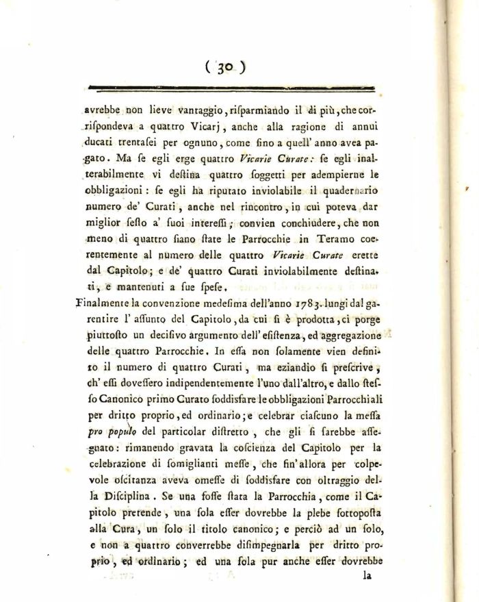 avrebbe non lieve vantaggio,rifparmiando il di più,checor-rifpondeva a quattro Vicarj , anche alla ragione di annui ducati trentafei per ognuno, come fino a quell' anno avea pagato. Ma fe egli erge quattro Vicarìe Curate: fe egli inalterabilmente vi deftina quattro foggetti per adempierne le obbligazioni : fe egli ha riputato inviolabile il quadernario numero de' Curati , anche nel rincontro , in cui poteva dar miglior fello a' fuoi intereffi ; convien conchiudere, che non meno di quattro fiano fiate le Parrocchie in Teramo coerentemente al numero delle quattro Vicarie Curate erette dal Capitolo; e de' quattro Curati inviolabilmente deftina. ti, e mantenuti a fue fpefe. Finalmente la convenzione medefima dell'anno 1783. lungi da! ga-rentire 1' attunto del Capitolo,da cui fi è prodotta,ci porge piuttofto un decifivo àrgumento dell'efiftenza,ed aggregazione delle quattro Parrocchie. In etta non folamente vien defini-io il numero di quattro Curati , ma eziandio fi prefcrive , eh' elfi dovettero indipendentemente l'uno dall'altro, e dallo ftef-fo Canonico primo Curato foddisfare le obbligazioni Parrocchiali per dritto proprio,ed ordinario;e celebrar ciafcuno lametta prò populo del particolar dillretto , che gli fi farebbe affe-gnato : rimanendo gravata la cofcieuza del Capitolo per la celebrazione di fomiglianti mette, che fin'allora per colpevole ofeitanza aveva omette di foddisfare con oltraggio della Difciplina . Se una fotte fiata la Parrocchia, come il Capitolo pretende , una fola etter dovrebbe la plebe fottopofia alla Cura, un folo il titolo canonico; e perciò ad un folo, e non a quattro converrebbe difimpegnarla per dritto proprio , ed ordinario ; ed una fola pur anche etter dovrebbe