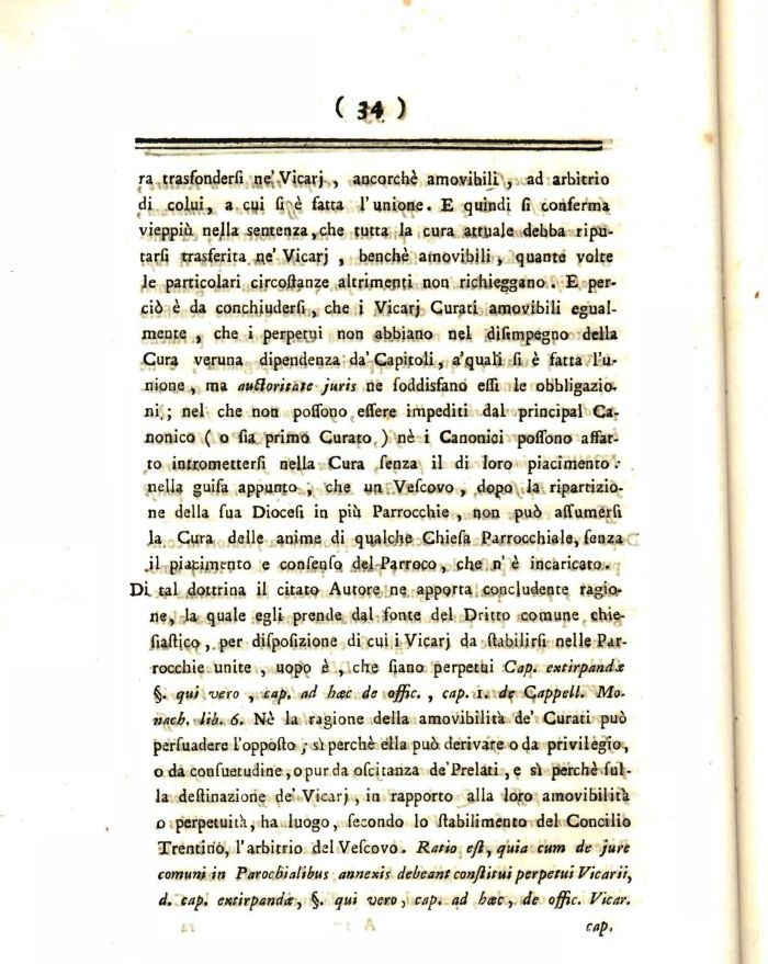 Di tal dottrina il citato Autore ne apporta concludente ragione, la quale egli prende dal fonte del Dritto comune chie-fiafiico , per difpofizione di cui i Vicarj da ftabilirfi nelle Parrocchie unite , uopo è , che fiano perpetui Cap. extirpandx qui vero , cap, ad hcec de offic. , cap. r. de Cappell. Monaci/. Uh. 6. Né la ragione della amovibilità de' Curati può perfuadere L'oppofto ; sì perchè ella può derivare oda privilegio, o da confuetudine ,opur da ofeitanza de'Prelati,e sì perchè fui -la detonazione de' Vicarj , in rapporto alla loro amovibilità o perpetuità, ha luogo, fecondo lo ftabilimento del Concilio Trentino, l'arbitrio del Vefcovo. Ratio efl,quia cum de jure comuni in Parochialibus annexis debeant confi itui perpetui Vicari d. cap. extirpanda, §. qui vero, cap. ad hcec, de offic. Vicar.