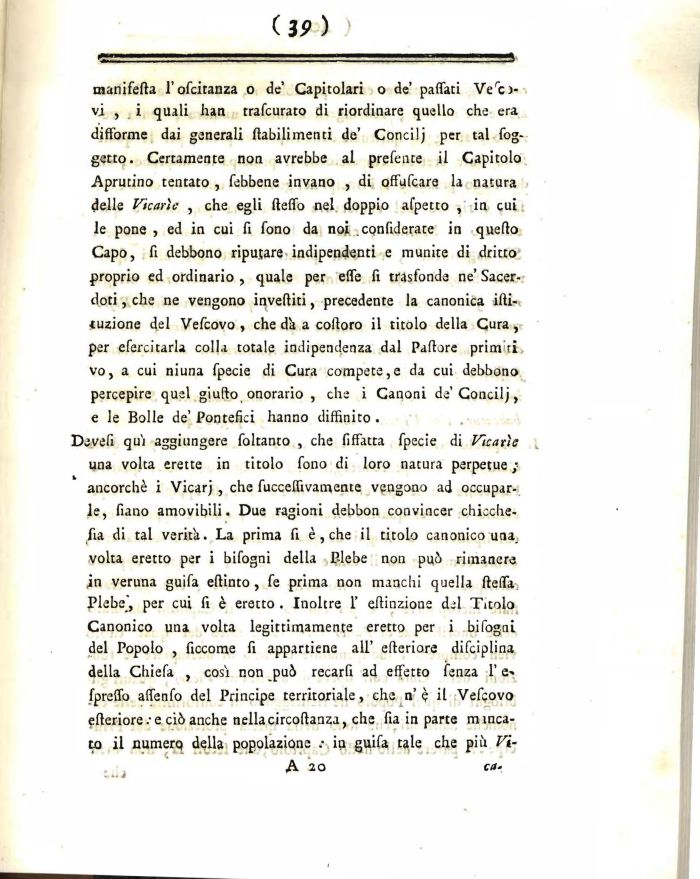manifefta l'ofciranza o de' Capitolari o de' pattati Verc>-vi , i quali han trafcurato di riordinare quello che era difforme dai generali ftabilimenti de' Conci!j per tal {oggetto. Certamente non avrebbe al prefente il Capitolo Aprutino tentato , febbene invano , di offufcare la natura delle Vicarìe , che egli fteffo nel doppio afpetto , in cui le pone , ed in cui fi fono da noi confiderate in quello Capo, fi debbono riputare indipendenti e munite di dritto proprio ed ordinario , quale per effe fi trasfonde ne' Sacerdoti , che ne vengono invertiti, precedente la canonica ifti-•tuzione del Vefcovo , che dà a coftoro il titolo della Cura, per efercitarla colla totale indipendenza dal Pallore prim ri vo, a cui niuna fpecie di Cura compete,e da cui debbono percepire quel giudo onorario , che i Canoni de'Concilj, e le Bolle de' Pontefici hanno diffinito .