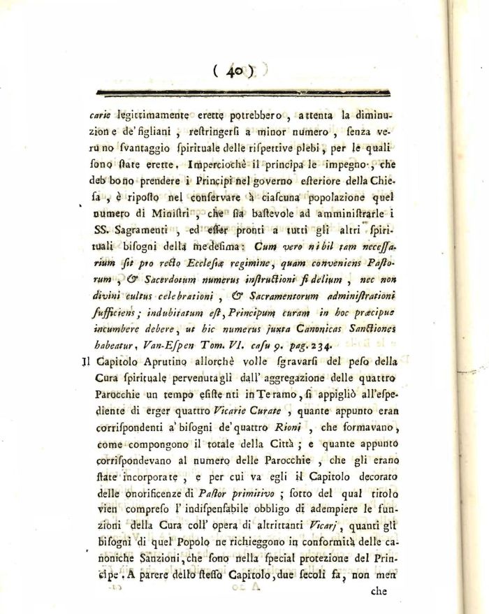 ]1 Capitolo Aprutino allorché volle fgravarfi del pefo della Cura fpirituale pervenutagli dall' aggregazione delle quattro Parocchie un tempo efifte nti in Te ramo, fi appigliņ all'efpe-diente di erger quattro Vicarie Curate , quante appunto eran corrifpondenti a'bifogni de'quattro Rioni , che formavano, come compongono il totale della Cittą ; e quante appunto corrifpondevano al numero delle Parocchie , che gli erano fiate incorporate , e per cui va egli U Capitolo decorato delle onorificenze di Pafģor primitivo ; fotto del qua! firolo vien comprefo 1' indifpenfabile obbligo di adempiere le funzioni della Cura coli'opera di altrirtanti Vicarj, quanti gli bifogni di quel Popolo ne richieggono in conformitą delle canoniche Sanzioni,che fono nella fpecial protezione del Principe . A parere dello fielfo Capitolo,due fecoli fa? non men 0 che