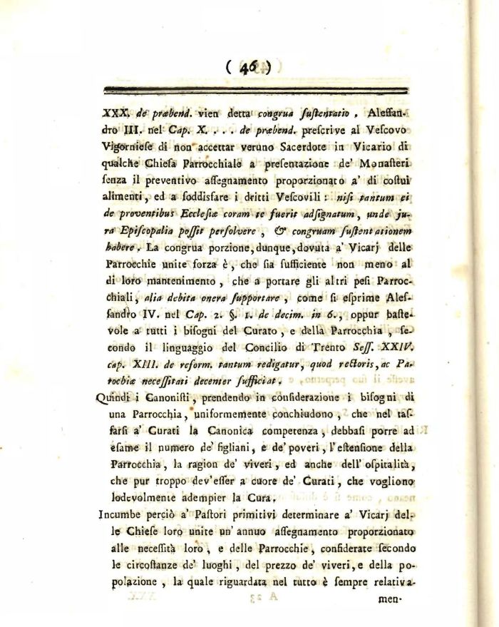 XXX» de prabertd. vieti detta' congrua fu fontano , Aleffan-dro III. nel Cap. X. . . . de prabend. preferive al Vefcovo Vigorniefe di non accettar veruno Sacerdote in Vicario di qualche Chiefa Parrocchiale a prefentazione de' Monafteri fenza il preventivo alfegnamento proporzionato ,a' di coftui alimenti, ed a foddisfare i dritti Vefcovili : nifi tantum ei de proventibus Ecclefia coram te fuerit adfignatum, un de ju-ra Epifcopalia pojjtt perfolvere , & congruam fuftent ationem kabere , La congrua porzione,dunque,dovuta a' Vicarj delle Parrocchie unite forza è , che fia fufficiente non meno al di loro mantenimento, che a portare gli altri pefi Parrocchiali, alia debita onera fupportare , come fi efprime Alef-fandro IV. nel Cap. 2. §. i. de decim. in 6., oppur bade-vole a tutti i bifogni del Curato , e della Parrocchia , fecondo il linguaggio del Concilio di Trento Sejf. XXIV. cap. XIII. de reform. tantum redìgatur, quod rettoris^ac P affochiti neceffitati decenter fufficiat.