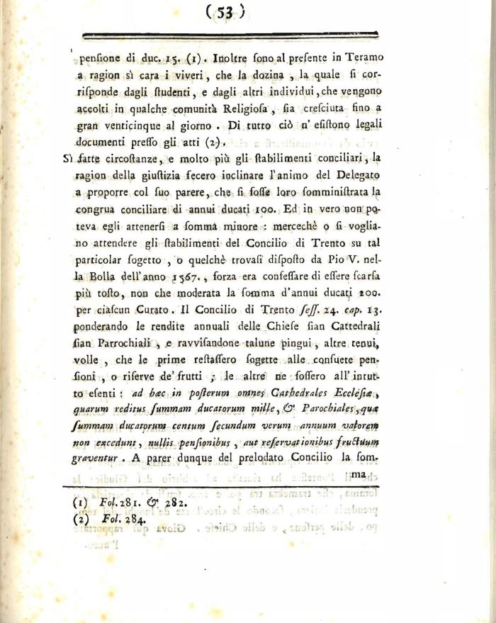 Sì fatte circoftanze, e molto più gli ftabilimenti conciliari, la ragion della giuftizia fecero inclinare l'animo del Delegato a proporre col fuo parere, che fi fotte loro fomminiftrata la congrua conciliare di annui ducati 100. Ed in vero non pQ-teva egli attenerli a fommà minore : mercechè o fi vogliano attendere gli fiabilimenti del Concilio di Trento su tal particolar fogetto , o quelchè trovafi difpofto da Pio V. nella Bolla dell'anno 1567. , forza era confettare di elfere fcarfa più tofto, non che moderata la fomma d'annui ducati 200. per ciafcun Curato. Il Concilio di Trento feJJ. 24. cap. 13. ponderando le rendite annuali delle Chiefe fian Cattedrali lìan Parrochiali , e ravvifandone talune pingui , altre tenui, volle , che le prime reftattero foggtte alle confuete pen-fioni , o riferve de' frutti ; le altre ne folfero all' intutto efenti : ad beee in pojìerum omne$ Catbedrales Eccleftce , quarum reditus fummam ducatorum mille Parocbiales yqux fummam ducatorum centum fecundum veruni annuum valorem non excedunt, nullis penfionibus , aut refervat ionibus fruttUum graventur . A parer dunque del prelodato Concilio la fom-