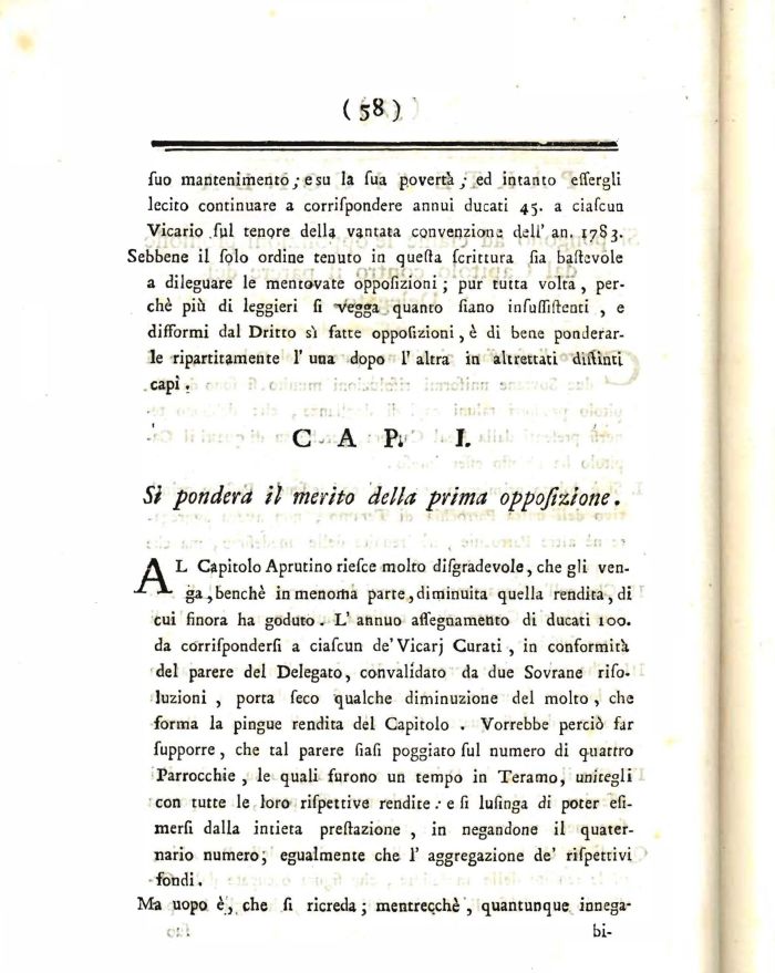 A L Capitolo Aprutino riefce molto difgradevole, che gli ven-ga, benché in menoma parte, diminuita quella rendita, di cui finora ha goduto. L' annuo aflegnamento di ducati 100. da corrifponderfi a ciafcun de' Vicarj Curati , in conformità del parere del Delegato, convalidato da due Sovrane rifoluzioni , porta feco qualche diminuzione del molto , che forma la pingue rendita del Capitolo . Vorrebbe perciò far fupporre , che tal parere fiafi poggiato fui numero di quattro Parrocchie , le quali furono un tempo in Teramo, unitegli con tutte le loro rifpettive rendite .• e fi lufinga di poter efi-merfi dalla intieta preftazione , in negandone il quaternario numero, egualmente che 1' aggregazione de' rifpettivi fondi.