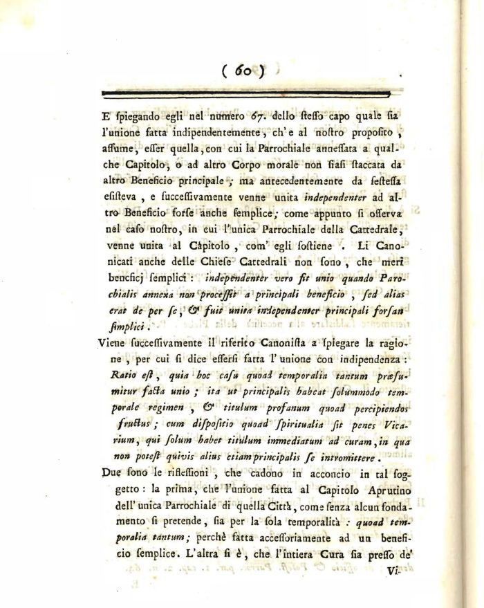 Viene fuccelfivamente il riferito Canonifėa a (piegare la ragione , per cui fi dice etterfi fatta 1' unione con indipendenza : Ratio efl , quia hoc cafu quoai temporalia tantum preefu-mitur fatta unio ; ita ut principalis babeat folummodo temporale regimen , & titulum profanum quoai percipiendos fruttus ; cum difpofitio quoad fpiritualia fit penes Fica-r 'tum, qui folum babet titulum immediatum ad curam ė in qua non potefl quivis alius etiam principalis fe intromittere . Due fono le rifleffioni , che cadono in acconcio in tal fog-getto : la prima, che l'unione fatta al Capitolo Aprutino dell'unica Parrochiale di quella Cittā, come fenza alcun fondamento fi pretende, fia per la fola temporalitā / quoad temporalia tantum; perchč fatta accefforiamente ad un beneficio femplice. L'altra fi č, che l'intiera Cura fia pretto de