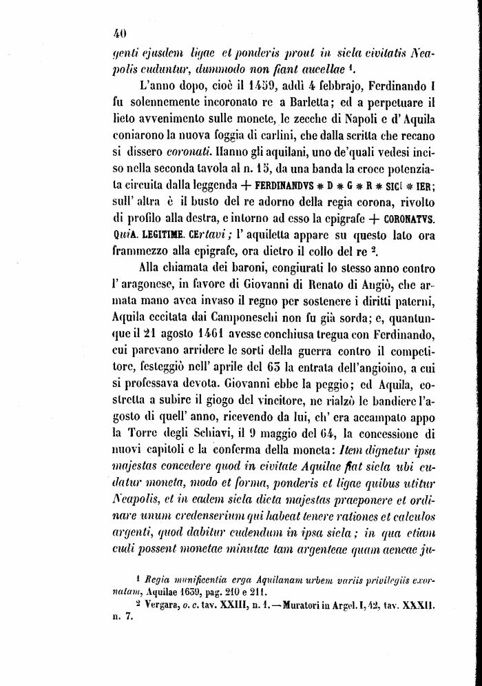 L'anno dopo, cioè il 14o9, addì 4 febbrajo, Ferdinando I fu solennemente incoronato re a Barletta ; ed a perpetuare il lieto avvenimento sulle monete, le zecche di Napoli e d'Aquila coniarono la nuova foggia di carlini, che dalla scritta che recano si dissero coronati. Hanno gli aquilani, uno de'quali vedesi inciso nella seconda tavola al n. 15, da una banda la croce potenziata circuita dalla leggenda + FERDINANDVS * D * G # R * siCi # IER; sul!' altra è il busto del re adorno della regia corona, rivolto di profilo alla destra, e intorno ad esso la epigrafe + COROHATVS. QUÌA.. LEGITIME. Urtavi; 1' aquiletta appare su questo lato ora frammezzo alla epigrafe, ora dietro il collo del re 2.
