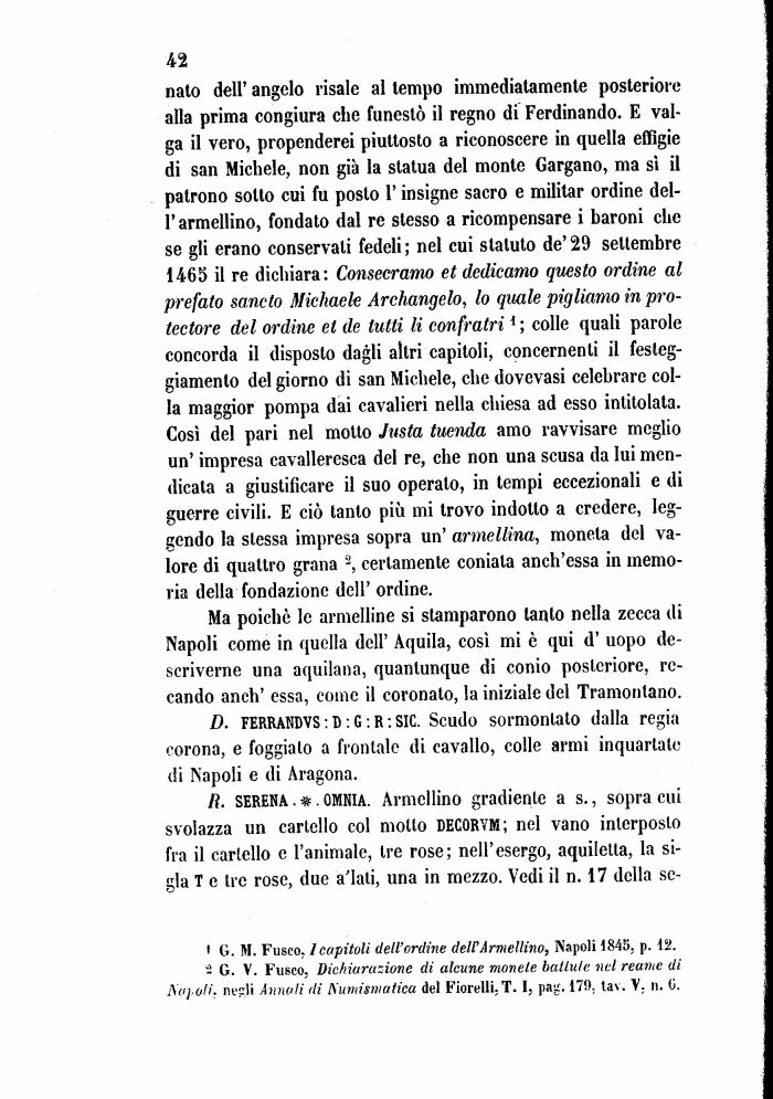 nato dell' angelo risale al tempo immediatamente posteriore alla prima congiura che funestò il regno di Ferdinando. E valga il vero, propenderei piuttosto a riconoscere in quella effigie di san Michele, non già la statua del monte Gargano, ma sì il patrono sotto cui fu posto 1" insigne sacro e militar ordine del-l'armellino, fondato dal re slesso a ricompensare i baroni che se gli erano conservali fedeli; nel cui stalulo de'29 sellembre 1465 il re dichiara: Consecramo et dedicamo questo ordine al prefato sancto Mìchaele Archangelo, lo quale pigliamo in pro-tectore del ordine et de lutti li confratriì ; colle quali parole concorda il disposlo dagli altri capitoli, concernenti il festeggiamento del giorno di san Michele, che dovevasi celebrare colla maggior pompa dai cavalieri nella chiesa ad esso inlilolala. Così del pari nel mollo Justa tuenda amo ravvisare meglio un' impresa cavalieresca del re, che non una scusa da lui mendicata a giustificare il suo operalo, in lempi eccezionali e di guerre civili. E ciò tanto più mi trovo indotto a credere, leggendo la stessa impresa sopra un' armellina, monela del valore di quallro grana "2, certamente coniala anch'essa in memoria della fondazione dell' ordine.