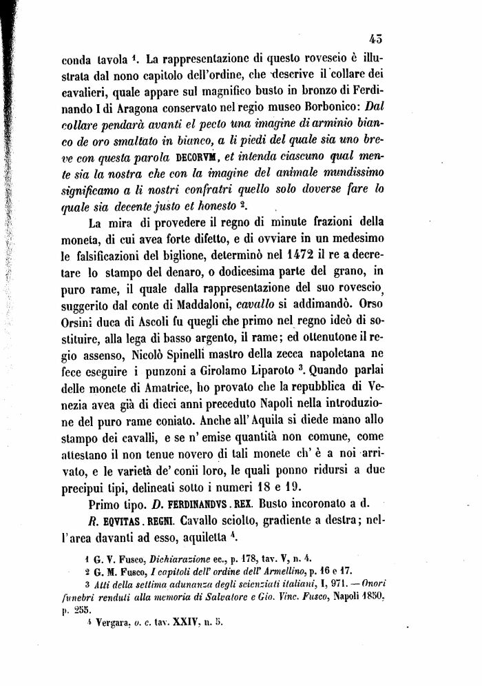 conda tavola i. La rappresentazione di questo rovescio è illustrala dal nono capitolo dell'ordine, che -descrive il collare dei cavalieri, quale appare sul magnifico busto in bronzo di Ferdi-nando I di Aragona conservato nel regio museo Borbonico: Dal collare pendarà avanti el pedo una imagine diarminio bianco de oro smaltato in bianco, a li piedi del quale sia uno breve con questa parola DECORVM, et intenda ciascuno qual mente sia la nostra che con la imagine del animale mundissimo significamo a li nostri confratri quello solo doverse fare lo quale sia decente justo et honesto 2.