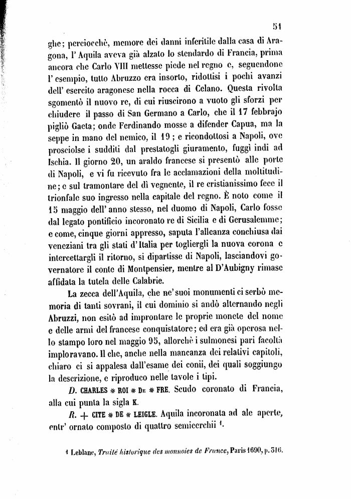La zecca dell'Aquila, che ne' suoi monumenti ci serbò memoria di tanti sovrani, il cui dominio si andò alternando negli Abruzzi, non esitò ad improntare le proprie monete del nome e delle armi del francese conquistatore ; ed era già operosa nello stampo loro nel maggio 95, allorché i sulmonesi pari facoltà imploravano. Il che, anche nella mancanza dei relativi capitoli, chiaro ci si appalesa dall'esame dei conii, dei quali soggiungo la descrizione, e riproduco nelle lavole i lipi.