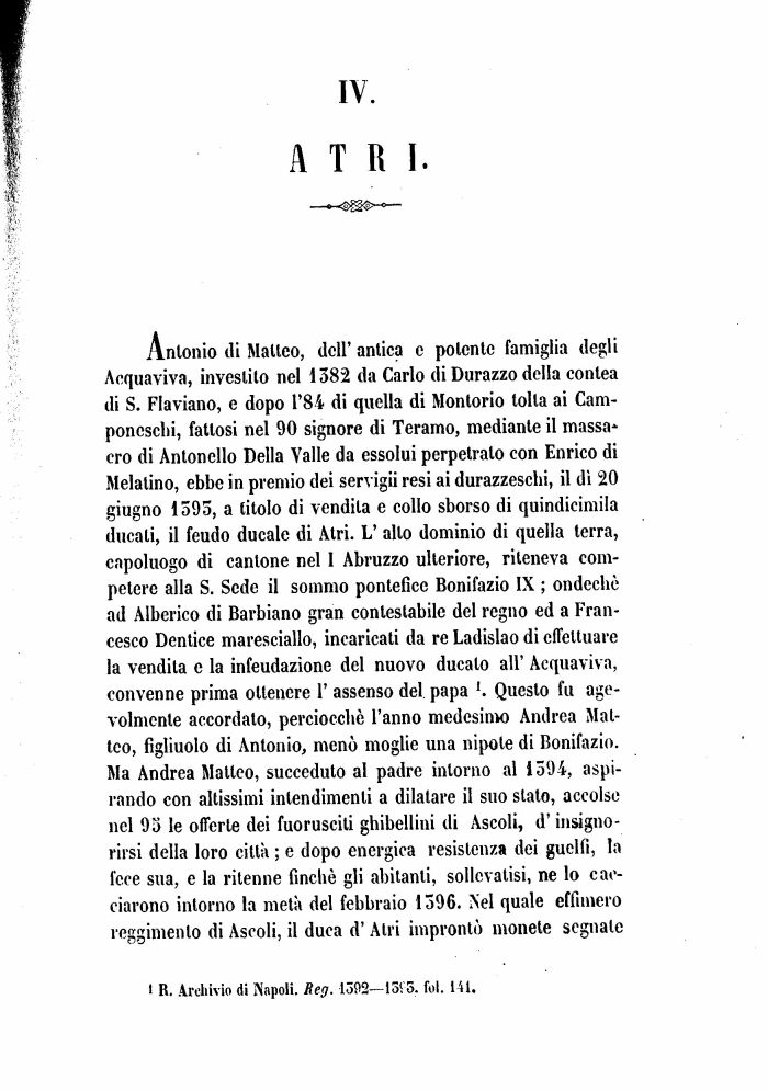 Antonio di Malico, dell' antica e polente famiglia degli Acquaviva, investito nel 1382 da Carlo di Durazzo della contea di S. Flaviano, e dopo l'84 di quella di Montorio tolta ai Cam-ponescbi, fattosi nel 90 signore di Teramo, mediante il massacro di Antonello Della Valle da essolui perpelralo con Enrico di Melatine, ebbe in premio dei servigli resi ai durazzescbi, il dì 20 giugno 1595, a titolo di vendita e collo sborso di quindicimila ducati, il feudo ducale di Atri. L' allo dominio di quella terra, capoluogo di cantone nel I Abruzzo ulteriore, riteneva com-pelere alla S. Sede il sommo pontefice Bonifazio IX ; ondechè ad Alberico di Barbiano gran conleslabile del regno ed a Francesco Denlice maresciallo, incaricali da re Ladislao di effettuare la vendita e la infeudazione del nuovo ducalo ali' Acquaviva, convenne prima ollenere 1' assenso del papa '. Queslo fu agevolmente accordato, perciocché l'anno medesinM) Andrea Malico, figliuolo di Antonio, menò moglie una nipote di Bonifazio. Ma Andrea Matleo, succedulo al padre intorno al 1594, aspirando con altissimi inlendimenli a dilatare il suo stato, accolse nel 95 le offerte dei fuorusciti ghibellini di Ascoli, d'insignorirsi della loro cillà ; e dopo energica resistenza dei guelfi, la fece sua, e la ritenne finché gli ahilanli, sollevatisi, ne lo cacciarono intorno la mela del febbraio 1396. Nel quale effimero reggimento di Ascoli, il duca d' Atri improntò monete segnale