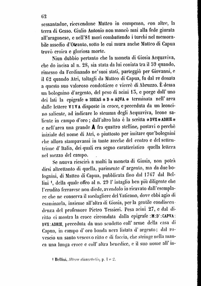 Se nuova riescirà a molli la monela di Giosia, non polrà dirsi alti-elianto di quella, parimente d' argento, ma da due bo-lognini, di Malico di Capua, pubblicata fino dal 1707 dal Bellini d, della quale offro al n. 29 l'intaglio ben più diligente che l'erudito ferrarese non diede, avendolo io ricavalo dall'esemplare che ne conserva il medagliere del Valicano, dove ebbi agio di esaminarla, insieme all'altra di Giosia, perla gentile condiscendenza del professore Pietro Tessieri. Pesa acini 27, e dal diritto ci mostra la croce circondata dalla epigrafe :M:D':CAPVA: DVX-.ADRIE, preceduta da uno scudetto coli' arme della casa di Capua, in campo d'oro banda nera listala d' argento; dal rovescio un santo vescovo rillo e di faccia, che siringe nella manca una lunga croce e coli' altra benedice, e il suo nome all'in-