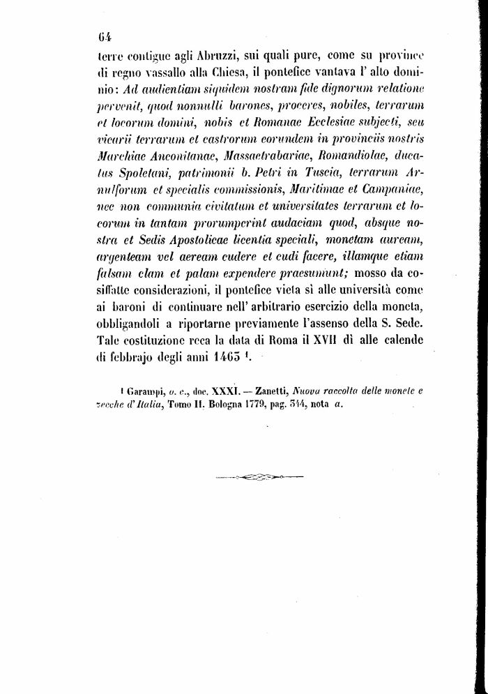 tene contigue agli Abruzzi, sui quali pure, come su provinco di regno vassallo alla Chiesa, il pontefice vantava 1' alto dominio: Ad audìenliam sùjuidem nostram fide dignorum relationc pcrvcnit, (juod nominili baroncs, proccrcs, nobiles, tcrrarum ci ìocorum domini, nobis et Romanac Ecclesinc subjecti, scu vicarii tcrrarum ci castrorum corundcm in provinciis nnstris Marchiac Anconilanac, Massactrabariac, Romandiolac, duca-lus Spoletani, patrimonii b. Pelvi in Tuscia, lerrarum Ar-nu I forum et specialis commissioni^, Maritimae et Campaniac, noe non communia civitatum et univcrsitatcs lerrarum ci lo-cornw in tantam prorumpcrint audaciam quod, absque nostra et Sedis Apostolica^ licentia speciali, monetarti aurcam, nryenteam vcl aeream elidere et cudi facere, illamque etiam falsam chini et palam expcnderc pracsumunt; mosso da cosiffatte considerazioni, il pontefice vieta sì alle università come ai baroni di continuare nell' arbitrario esercizio della moneta, obbligandoli a riportarne previamente l'assenso della S. Sede. Tale costituzione reca la data di Roma il XVII dì alle calcnde di fcbbrajo degli anni 14G5 J.