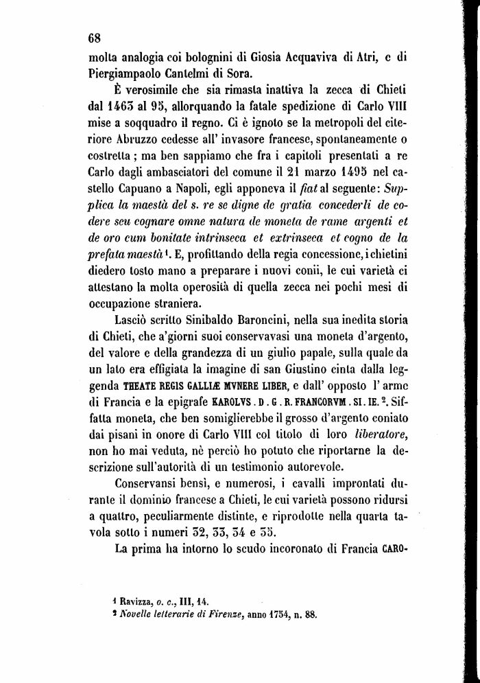 Lasciò scrilto Sinibaldo Baroncini, nella sua inedila storia di Chieti, che a'giorni suoi conservavasi una monela d'argento, del valore e della grandezza di un giullo papale, sulla quale da un lalo era effigiala la imagine di san Giustino cinta dalla leggenda THEATE REG1S GALLI£ MVNERE LIBER, e dall' opposto 1' arme di Francia e la epigrafe KAROLVS. D.G.R.FRANCORVM.SI.IE.2. Siffatta moneta, che ben somiglierebbe il grosso d'argento coniato dai pisani in onore di Carlo Vili col titolo di loro liberatore, non ho mai veduta, né perciò ho potuto che riportarne la descrizione sull'autorità di un testimonio autorevole.