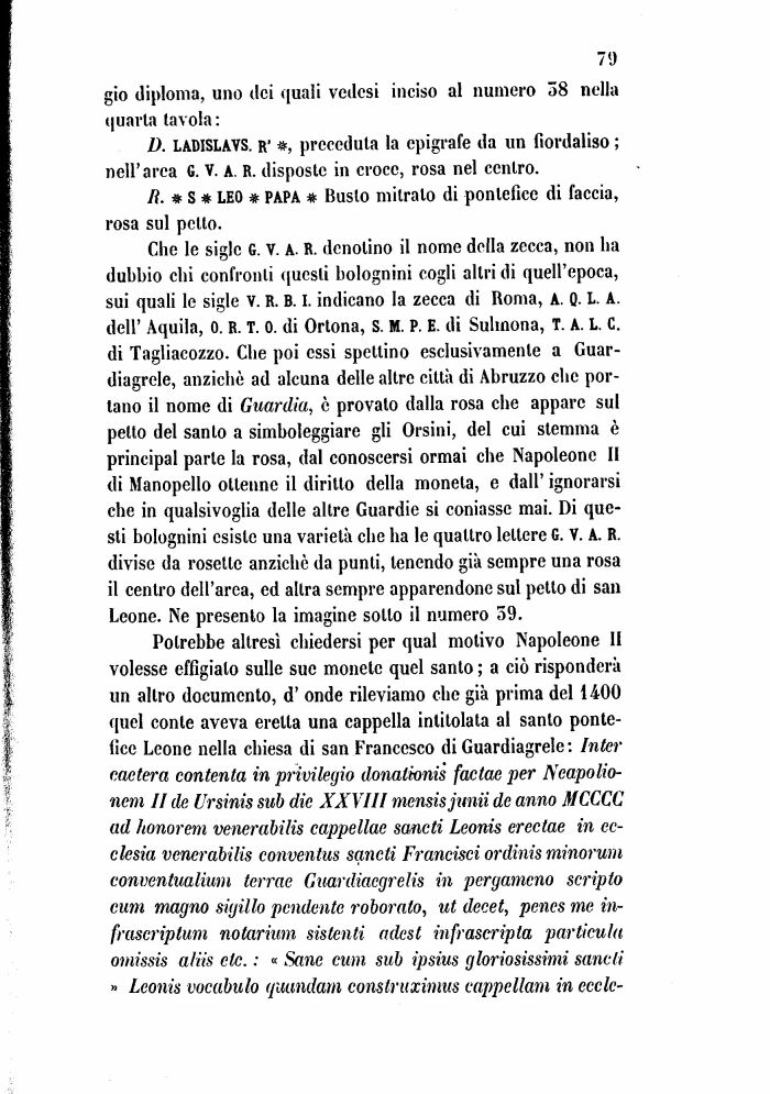 Che le sigle G. V. A. R. denotino il nome della zecca, non ha dubbio chi confronti questi bolognini cogli altri di quell'epoca, sui quali le sigle v. R. B. I. indicano la zecca di Roma, A. Q. L. A. dell' Aquila, 0. R. T. 0. di Ortona, S. M. P. E. di Suhnona, T. A. L. C. di Tagliacozzo. Che poi essi spettino esclusivamente a Guar-diagrele, anziché ad alcuna delle altre città di Abruzzo che portano il nome di Guardia, è provato dalla rosa che appare sul petto del santo a simboleggiare gli Orsini, del cui stemma è principal parte la rosa, dal conoscersi ormai che Napoleone II di Manopello ottenne il diritto della moneta, e dall' ignorarsi che in qualsivoglia delle altre Guardie si coniasse mai. Di questi bolognini esiste una varietà che ha le quattro lettere G. V. A. R. divise da rosette anziché da punti, tenendo già sempre una rosa il centro dell'area, ed altra sempre apparendone sul petto di san Leone. Ne presento la imagine sotto il numero 59.