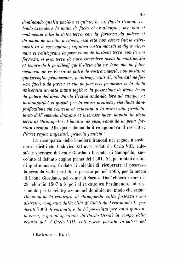 dominando quella pacifice et quieti'., lo m. Pardo l'rsino, volendo cxtcnderc la mano de facto et ex abruplo, per vini ci violenciam tolse la detta terra con la fortecza da potere e/ da mano de la cita prcdicla, essa cita non essere intesa altrimenti in le soe rughine; supplica vostra maestà se dicjnc ritornare et reintegrare la posscxione de la dieta terra con la sua fortecza, et essa terra de novo concedere iuxta la continentia et tenore de li privilcgij quali dieta cita ne tene da la felice memoria de re Ferrante patre de vostra maestà, non obstante qualscvoglia promissione, privilegij, capiluli, albarani ne fossero facti o da farse; et che dejure era promesso a la dieta università armata manu togliere la posscxione de dieta terra da potere del diclo Pardo Ursino andando loro ad campo, et la dampnificò et guastò per la causa prediota; che dieta dam-pnifìcatione sia remcssa et rclaxala a la università predichi, tanto dell' emenda dampno et interesse have havuto la dieta terra di Manuppello et ho mi ni de epsci, como de la pena for-sitan incorsa. Alla quale domanda il re apponeva il rescritto : Placet regiac majcstati, praeviajusticia i.