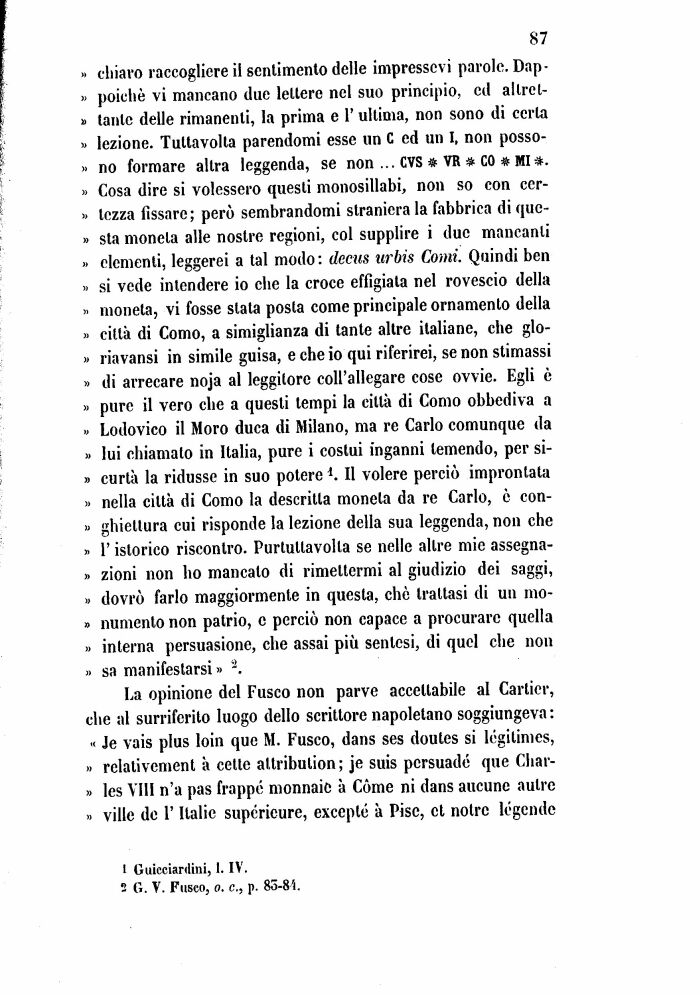 » chiaro raccogliere il sentimento delle impressevi parole. Dap-» poiché vi mancano due lettere nel suo principio, ed allrel-» tante delle rimanenti, la prima e 1' ultima, non sono di certa » lezione. Tultavolta parendomi esse un C ed un I, non posso-» no formare altra leggenda, se non ... CVS * VR * CO * MI*. » Cosa dire si volessero questi monosillabi, non so con cer-» lezza fissare; però sembrandomi straniera la fabbrica di que-» sta moneta alle nostre regioni, col supplire i due mancanti » clementi, leggerei a tal modo : decus urbìs Comi. Quindi ben » si vede intendere io che la croce effigiata nel rovescio della « moneta, vi fosse stata posta come principale ornamento della » città di Como, a simiglianza di tante altre italiane, che glo-» riavansi in simile guisa, e che io qui riferirei, se non stimassi » di arrecare noja al leggitore coll'allegare cose ovvie. Egli è » pure il vero che a questi tempi la città di Como obbediva a « Lodovico il Moro duca di Milano, ma re Carlo comunque da » lui chiamato in Italia, pure i costui inganni temendo, per si-» curia la ridusse in suo potere1. Il volere perciò improntata » nella città di Como la descritta moneta da re Carlo, è conii gbiettura cui risponde la lezione della sua leggenda, non che » l'isterico riscontro. Purtultavolla se nelle altre mie assegna-» zioni non ho mancato di rimettermi al giudizio dei saggi, « dovrò farlo maggiormente in questa, che trattasi di un mo-» numento non patrio, e perciò non capace a procurare quella » interna persuasione, che assai più senlesi, di quel che non » sa manifestarsi» 2.