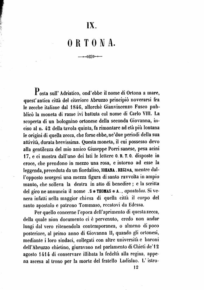 Tosta sul!' Adriatico, ond'ebbe il nome di (Mona a mare, quest'antica città del citeriore Abruzzo principiò noverarsi fra le zecche italiane dal 1846, allorché Gianvincenzo Fusco pubblicò la moneta di rame ivi battuta col nome di Carlo Vili. La scoperta di un bolognino ortonese della seconda Giovanna, inciso al n. 42 della tavola quinta, fa rimontare ad età più lontana le origini di quella zecca, che forse ebbe, ne'due periodi della sua attività, durala brevissima. Questa moneta, il cui possesso devo alla gentilezza del mio amico Giuseppe Porri sanese, pesa acini 17, e ci mostra dall'uno dei lati le lettere 0. R. T. 0. disposte in croce, che prendono in mezzo una rosa, e intorno ad esse la leggenda, preceduta da un fiordaliso, IOHAHA. REGIMA, mentre dall'opposto scorgesi una mezza figura di santo ravvolta in ampio manto, che solleva la destra in atto di benedire ; e la scritta del giro ne annuncia il nome .S * THOMAS * A., apostolus. Si venera infatti nella maggior chiesa di quella città il corpo del santo apostolo e patrono Tommaso, recatovi da Edessa.