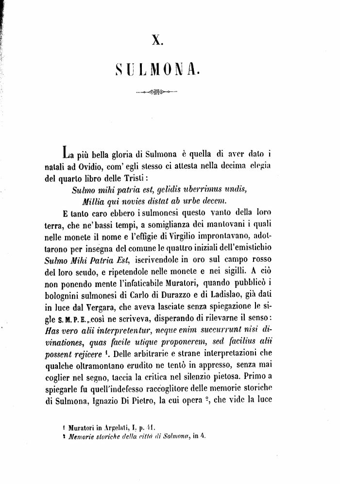 E tanto caro ebbero i sulmonesi questo vanto della loro terra, che ne'bassi tempi, a somiglianzà dei mantovani i quali nelle monete il nome e l'effìgie di Virgilio improntavano, adottarono per insegna del comune le quattro iniziali dell'emistichio Sulmo Mihi Patria Est, iscrivendole in oro sul campo rosso del loro scudo, e ripetendole nelle monete e nei sigilli. A ciò non ponendo mente l'infaticabile Muratori, quando pubblicò i bolognini sulmonesi di Carlo di Durazzo e di Ladislao, già dati in luce dal Vergara, che aveva lasciate senza spiegazione le sigle S.M.P.E.,,così ne scriveva, disperando di rilevarne il senso: Mas vero alii interpretentur, ncque enim succurrunt nisi di-vinationes, quas facile ulique proponerem, sed facilius alii possent rejicere '. Delle arbitrarie e strane inlerprelazioni che qualche oltramontano erudito ne tentò in appresso, senza mai coglier nel segno, taccia la critica nel silenzio pietosa. Primo a spiegarle fu quell'indefesso raccoglitore delle memorie storielle di Sulmona, Ignazio Di Pietro, la cui opera °-, che vide la luce