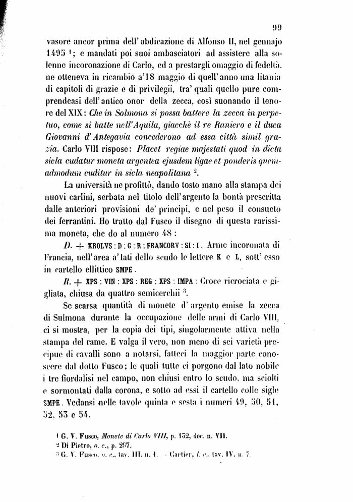 Se scarsa quantità di monete d' argento emise la zecca di Sulmona durante la occupazione delle armi di Carlo Vili, ci si mostra, per la copia dei tipi, singolarmente attiva nella slampa del rame. E valga il vero, non meno di sci varietà precipue di cavalli sono a notarsi, falleci la maggior parie conoscere dal dolio Fusco; le quali lulte ci porgono dal lalo nobile i Ire fiordalisi nel campo, non chiusi entro lo scudo, ma sciolti e sormontali dalla corona, e sotlo ad essi il cartello colle sigle SMPE. Vedansi nelle (avole quinta e sosta i numeri 49, 50, 51, 5:2. 55 e 54.