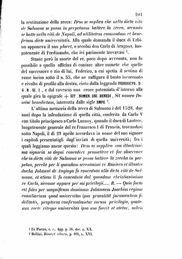 la restituzione della zecca: Itrm se suplica che nella dieta ci/a de Sulmona se possa in perpetuimi battere la zecca, secundo se batte nella cita de Napoli, ad utilitàtem cominodum et bene-fìcium diete univcrsitatis. Alla quale domanda il duca di Urbi-nò apponeva il suo placet, e secolili don Carlo di Aragoiin, luogotenente di Ferdinando, che ivi parimente Irovavasi '.