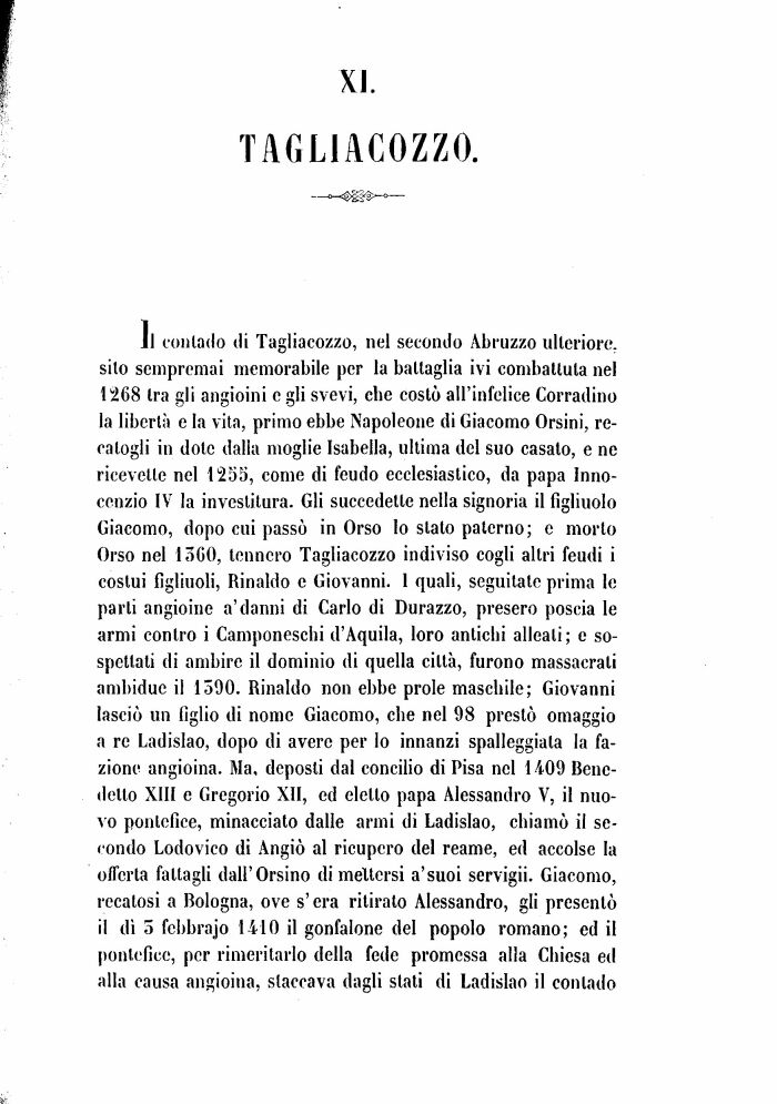 ì\ contado di Tagliacozzo, nel secondo Abruzzo ulteriore, sito sempremai memorabile per la battaglia ivi combattuta nel 1268 tra gli angioini e gli svevi, che costò all'infelice Corradino la libertà e la vita, primo ebbe Napoleone di Giacomo Orsini, recatogli in dote dalla moglie Isabella, ultima del suo casato, e ne ricevette nel 12a5, come di feudo ecclesiastico, da papa Inno-cenzio IV la investitura. Gli succedette nella signoria il figliuolo Giacomo, dopo cui passò in Orso lo stato paterno; e morto Orso nel I3CO, tennero Tagliacozzo indiviso cogli altri feudi i costui figliuoli, Rinaldo e Giovanni. 1 quali, seguitate prima le parli angioine a'danni di Carlo di Durazzo, presero poscia le armi contro i Camponeschi d'Aquila, loro anticbi alleali; e so-spetlati di ambire il dominio di quella ciltà, furono massacrali ambidue il 1590. Rinaldo non ebbe prole maschile; Giovanni lasciò un figlio di nome Giacomo, che nel 98 prestò omaggio a re Ladislao, dopo di avere per lo innanzi spalleggiata la fazione angioina. Ma, deposti dal concilio di Pisa nel 1409 Benc-dello XIII e Gregorio XII, ed elello papa Alessandro V, il nuovo pontefice, minacciato dalle armi di Ladislao, chiamò il secondo Lodovico di Angiò al ricupero del reame, ed accolse la offerta fallagli dall'Orsino di mettersi a'suoi servigii. Giacomo, recatosi a Bologna, ove s'era ritirato Alessandro, gli presentò il dì o fcbbrajo 1410 il gonfalone del popolo romano; ed il pontefice, per rimeritarlo della fede promessa alla Chiesa ed alla causa angioina, slaccava dagli stali di Ladislao il conlado