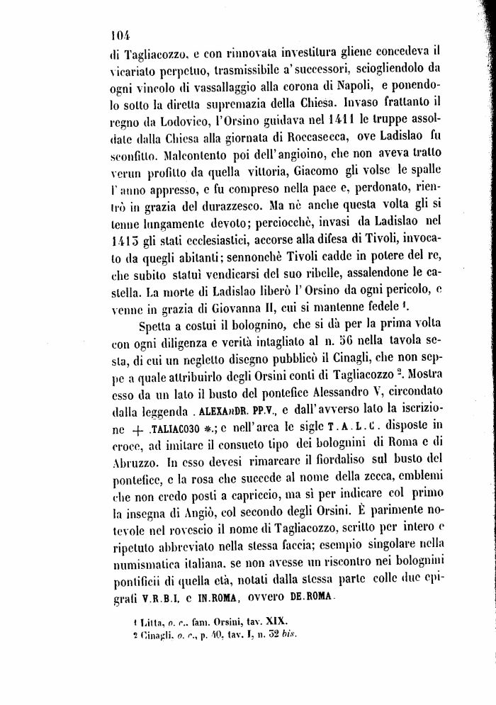 Spella a costui il bolognino, che si da per la prima volla con ogni diligenza e verità inlaglialo al n. 56 nella lavola sesia, di cui un neglelto disegno pubblicò il Cinagli, che non seppe a quale attribuirlo degli Orsini conti di Tagliacozzo -. Mostra esso da un lato il busto del ponlefice Alessandro V, circondalo dalla leggenda . ALEXAnDR. PP.V., e dall'avverso lalo la iscrizione -f .TALIAC030 *.; e nell'arca le sigle T. A.L.C. disposte in croco, ad imitare il consueto tipo dei bolognini di Roma e di Abruzzo. In esso devesi rimarcare il fiordaliso sul busto del ponlefice, e la rosa che succede al nome della zecca, emblemi che non credo posli a capriccio, ma sì per indicare col primo la insegna di Angiò, col secondo degli Orsini. È parimenle notevole nel rovescio il nome di Tagliacozzo, scrino per intero e ripetuto abbrevialo nella slessa faccia; esempio singolare nella numismalica italiana, se non avesse un riscontro nei bolognini pontificii di quella età, nolali dalla stessa parte colle «lue epigrafi V.R.B.I, C IN.ROMA, ovvero DE.ROMA.