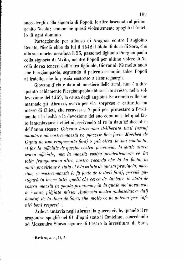 Ardeva tuttavia negli Abruzzi la guerra civile, quando il re aragonese spogliò nel 61 d'ogni slalo il Cantclrno, concedendo ad Alessandro Sforza signore di Pesavo la investitura di Sora,