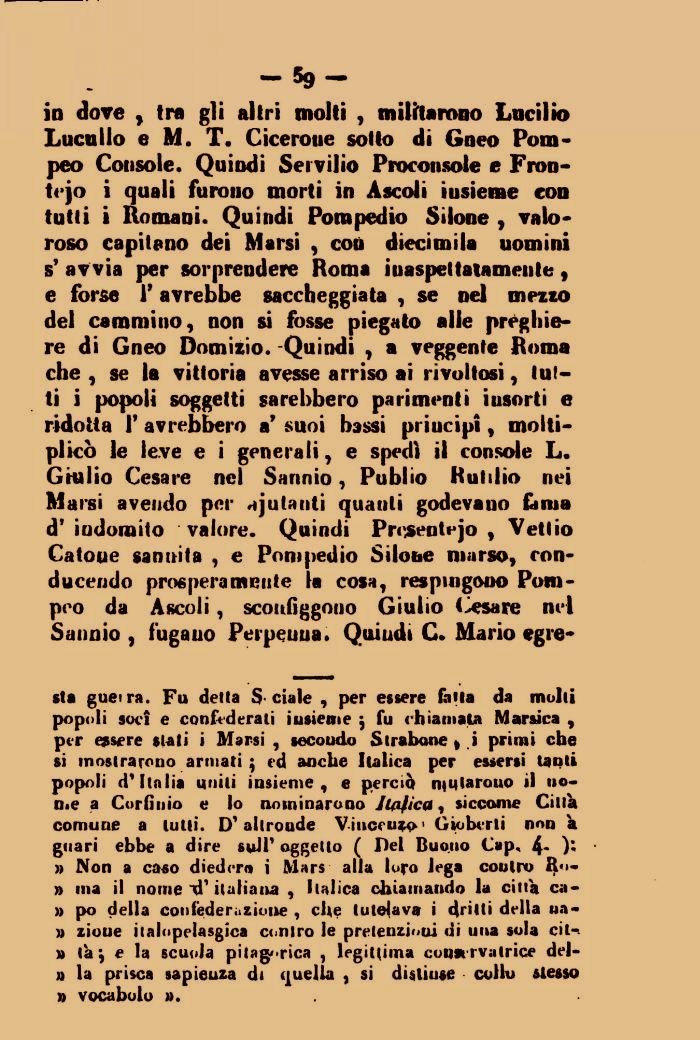 in dove y tra gli altri molti , militarono Lucilio Lucullo e M. T. Cicerone sotto di Gneo Pompeo Console. Quindi Seivilio Proconsole e Frontino i quali furono morti in Ascoli iusierae con tutti i Romani. Quindi Pompedio Silone , valoroso capitano dei Marsi , con diecimila uomini s' avvia per sorprendere Roma inaspettatamente, e forse l'avrebbe saccheggiata , se nel mezzo del cammino, non si fosse piegato alle preghiere di Gneo Domizio. -Quindi , a veggente Roma che , se la vittoria avesse arriso ai rivoltosi, tutti i popoli soggetti sarebbero parimenti iusorti e ridotta l'avrebbero a' suoi bassi principi, moltiplicò le leve e i generali, e spedi il console L. Giulio Cesare nel Sarinio, Publio Kutilio nei Marsi avendo per njutanti quanti godevano Cima d* indomito valore. Quindi Presenti* jo , Veti io Catoue sannita , e Pompedio Silone marso, con-ducendo prosperameute la cosa, respingono Pompeo da Ascoli, sconfiggono Giulio Osare nel Sannio , fugano Perpeuua. Quindi C» Mario egre-