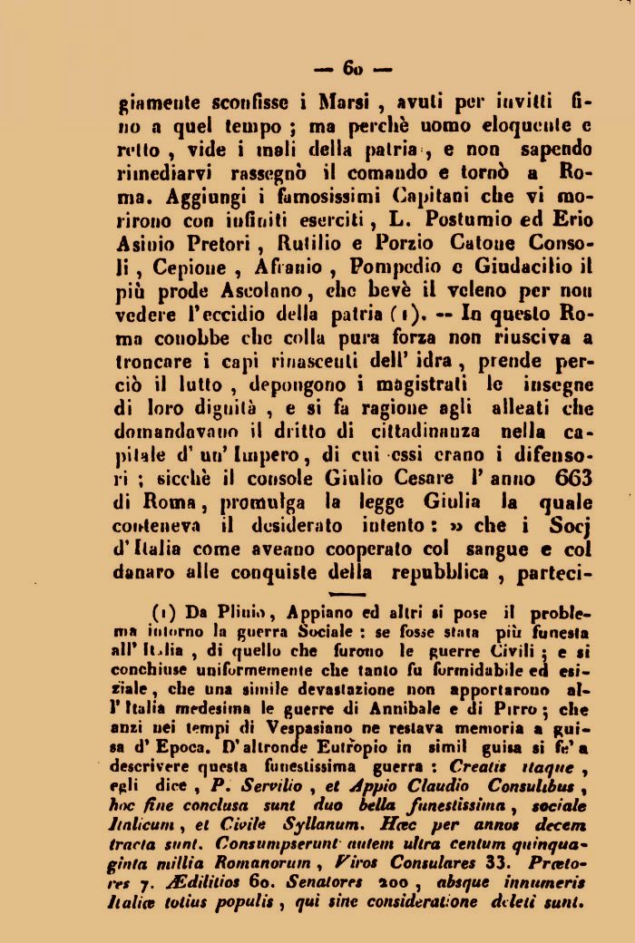 giameute sconfisse i Marsi , avuti per invilii fino a quei tempo ; ma perchè uomo eloquente e retto , vide i inali della patria , e non sapendo rimediarvi rassegnò il comando e tornò a Roma. Aggiungi i fumosissimi Capitani che vi morirono con infiniti eserciti, L. Postumio ed Erio Asinio Pretori , Rutilio e Porzio Catone Consoli , Cepioue , Afrauio , Po m peci io c Giudacilio il più prode Ascolano, clic beve il veleno per non vedere l'eccidio della patria fi), — Io questo Roma couobbe clic colla pura forza non riusciva a troncare i capi rinascenti dell' idra , prende perciò il lutto , depongono i magistrati le insegne di loro dignità , e si fa ragione agli alleati che domandavano il dritto di cittadinanza nella capitale d'un'Impero, di cui essi erano i difensori ; sicché il console Giulio Cesare 1' anno 663 di Roma, promulga la legge Giulia la quale conteneva il desiderato intento : » che i Socj d'Italia come aveano cooperato col sangue e col danaro alle conquiste della repubblica , parteci-