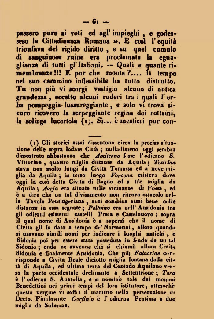 (i) Gli storici assai dissentono circa la precisa situazione delle sopra lodate Città 5 nulladimeno oggi sembra dimostralo abbastanza che Amiterno f«»sse odierno S. Vittorino , quattro miglia distante da Aquila ; lestrina stava non molto lungi da Civita Tomassa ed a nove miglia da Àquila ; in terzo lungo Forcona esisteva dove oggi la così detta Civita di Bagno ed a tre miglia da Aquila \ Aveja era situata nelle vicinanze di Fossa , ed è a dire che un tal divisa mento non ritrova ostacolo nella Tavola Peutingeriana , anzi combina assai bene colle distanze in essa segnate; Peltuino era nelP Ànsidonia tra £li odierni esistenti castelli Prata e Castel nuovo : sopra il qual nome di Ans'donia % a sapersi che il uome di Civita gli fu dato a tempo de' Normanni, allora quando si usavano simili nomi per indicare i luoghi antichi , e Sidonia poi per essere stata posseduta in feudo da un t:il Sidonio j onde ne avvenne clié si chiamò allora Civile Sidouia e finalmente Ànsidonia. Che più Falacrine corrisponde a Civita Reale diciotto miglia lontana dalla città di Aquila , ed ultima terra del Contado Aquilano ver* so la parte occidentale declinante a Settentrione ; Tura e P odierna S. Anatolia , t si nominò tale dai motivi Benedettini uei primi tempi del loro istitutore, attesoché questa vergine vi soffrì il martirio nella persecuzione di Decio. Finaluiinte Corfiwo e P odierna Pentirmi a due miglia da Sulinoua.