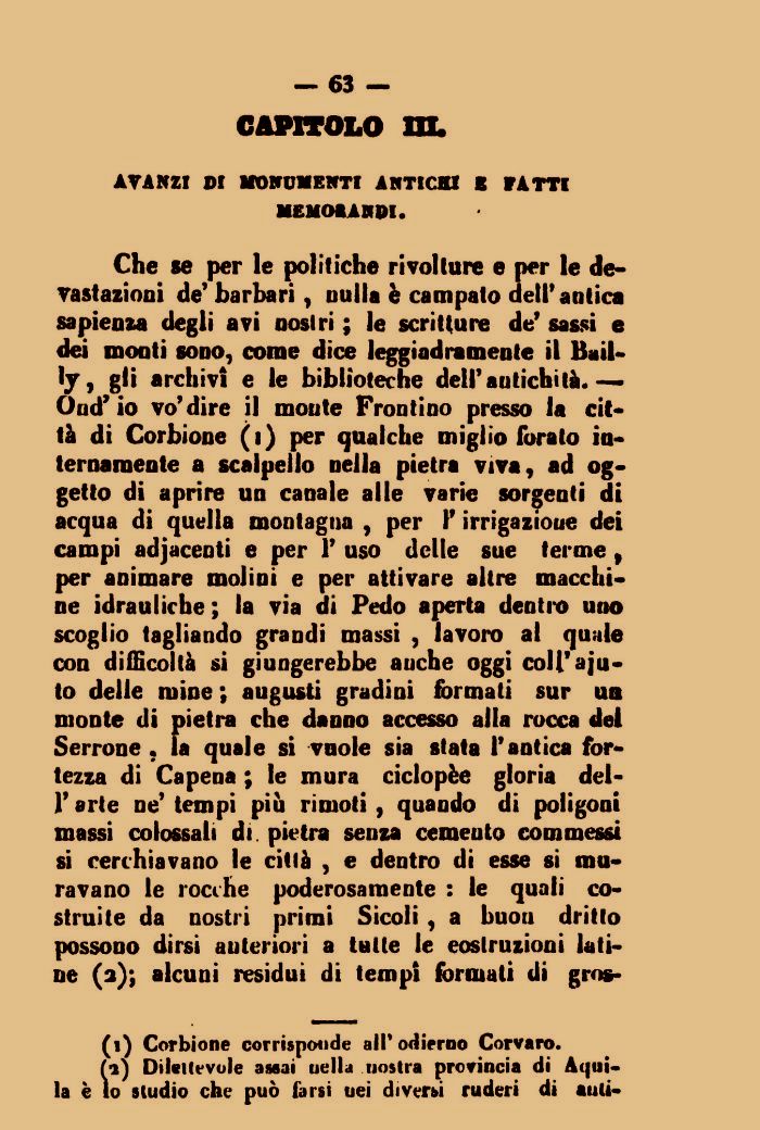 Che se per le politiche rivolture e per le de-Yastazioni de9 barbari , nulla è campato dell9 antica sapienza degli avi nostri ; le scritture de9 sassi e dei monti sono, come dice leggiadramente il Bail-ly, gii archivi e le biblioteche dell'antichità.—» Ond'io vo'dire il monte Frontino presso la città di Corbione (i) per qualche miglio forato internamente a scalpello nella pietra viva, ad oggetto di aprire un canale alle varie sorgenti di acqua di quella montagna , per l9 irrigazione dei campi adjacenti e per 1' uso delle sue terme, per animare molini e per attivare altre macchine idrauliche ; la via di Pedo aperta dentro uno scoglio tagliando grandi massi , lavoro al quale con difficoltà si giungerebbe anche oggi coll'aju-to delle mine ; augusti gradini formati sur un monte di pietra che danno accesso alla rocca dei Serrone • la quale si vuole sia stata l'antica fortezza di Capena ; le mura ciclopèe gloria dell'arte ne9 tempi più ri moti, quando di poligoni massi colossali di. pietra senza cemento commessi si cerchiavano le citlà , e dentro di esse si muravano le rocche poderosamente : le quali costruite da nostri primi Sicoli , a buou dritto possono dirsi auteriori a tutte le eostruzioni latine (2); alcuni residui di tempi formati di gros-