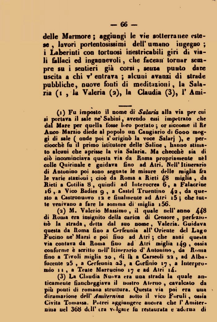 (1) Fu imposto il nome di Salaria alla via per cui si portava il saie ne9 Sabini, avendo essi impetrato che dal Mare per quella l'osse loro portato ; or siccome il Re Anco Marzio diede al popolo un Gaugiario di 6ooo moggi di sale ( onde poi s' originò la voce Salarj ), e perciocché fu il primo istitutore delle Saline , hanno stimato alcuni che aprisse la via Salaria. Ma checché sia di ciò incominciava questa via da Roma propriamente nfcl colle Quirinale e guidava fino ad Atri. Neil'Itinerario di Antonino poi sono segnata le misure delle miglia lira le varie slazioui j cioè da Roma a Rieti 48 miglia , da Rieti a Gotilia 8, quindi ad Inlerocrea 6, a Fai acri ne 16 , a Vico Badies 9 , a Castel Truentino 42 1 da questo a Castronuovo 12 e filialmente ad Atri i5; che tulte venivano a fare la somma di miglia i56.