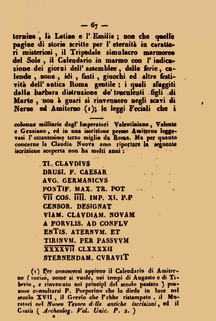 colonne milliarie dagl' Imperatori Valenliniano, Valente e Graziano, ed in una iscrizione presso Amiterno legge-vasi F ottantesimo terzo miglio da Roma. Ma per quanto concerne la Claudia Nuova amo riportare la seguente iscrizione scoperta non ha molti anni :