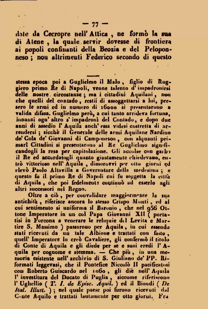 Oltre a ciò , per convalidare maggiormente la sua antichità , riferisce ancora lo stesso Crispo Monti , ed al cui sentimento si uniforma d Barouio , che nel g56 Ottone Imperatore in un col Papa Giovanni XII ( portatisi in Forcona a venerare le reliquie dt! Levita e Martire S. Massimo ) passarono per Aquila , iu cui essendo stali ricevuti da un tale Albione e trattati con fasto , queir Imperatore lo creò Cavaliere, gli confermò il titolo di Conte di Aquila e gli diede per se e suoi eredi V A-quila per cognome e stemma. — Che più , in una memoria esistente nelf archivio di S. Giuliano de' PP. Riformati leggevasi, che il Pontefice Niccolò li pacificatosi cou Roberto Guiscardo nel 1060, gli diè nell'Aquila I' investitura del Ducato di Puglia , siccome riferiscono 1' Ugliellio ( 1\ /. de Episc. A quii. ) ed il Biondi ( De JlaL Illusi. ) ; nel quale paese poi furono ricevuti dal C ute Aquilo e trattati lautamente per otto giorni. Fra