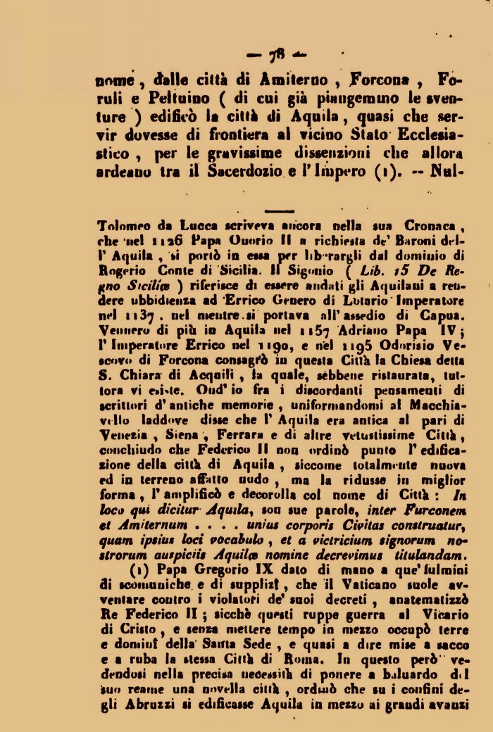 Tolomeo da Lueea scriveva ancora nella sua Cronaca , che nel ti 16 Papa Onorio II a richiesta Baroni dell' Aquila , si portò in essa per liberargli dal dominio di Rogerio Conte di Sicilia. Il Sigouio ( Lib. tS De Regno •Sicilia* ) riferisce di essere andati gli Aquilani a rendere ubbidienza ad Errico Genero di Lotario Imperatore nel 1137. nel mentre.si portava all'assedio di Capua. Vennero di più in Aquila nel 1157 Adriano Papa IV j l'Imperatore Errico nel 1190, e nel ng5 Odorisio Vescovo di Forcona consagfò in questa Citìk la Chiesa delta S. Chiara di Acquili , la quale, sebbene rislaurata, tuttora vi e»i«te. Oud' io fra i discordanti pensamenti di scrittori d' antiche memorie , uniformandomi al Macchia-v«Uo laddove disse che I' Aquila era antica al pari di Venezia , Siena , Ferrara e di altre vetustissime Citili, couchiudo che Federico II non ordini punto V edificazione della citili di Aquila , siccome totalmente nuova ed in terreno affitto nudo , ma la ridusse iti miglior forma , 1' amplificò e decorolla col nome di Cini : In loca qui dicitur Aquila, son sue parole, inler Furconem et Amiternum . . . . unius c or poris Civitas construatur, quam ipiiu* loci vocabulo , et a victricium signorum no-itrorum auspiciit Aquile* nomine decrevimus titulandam.