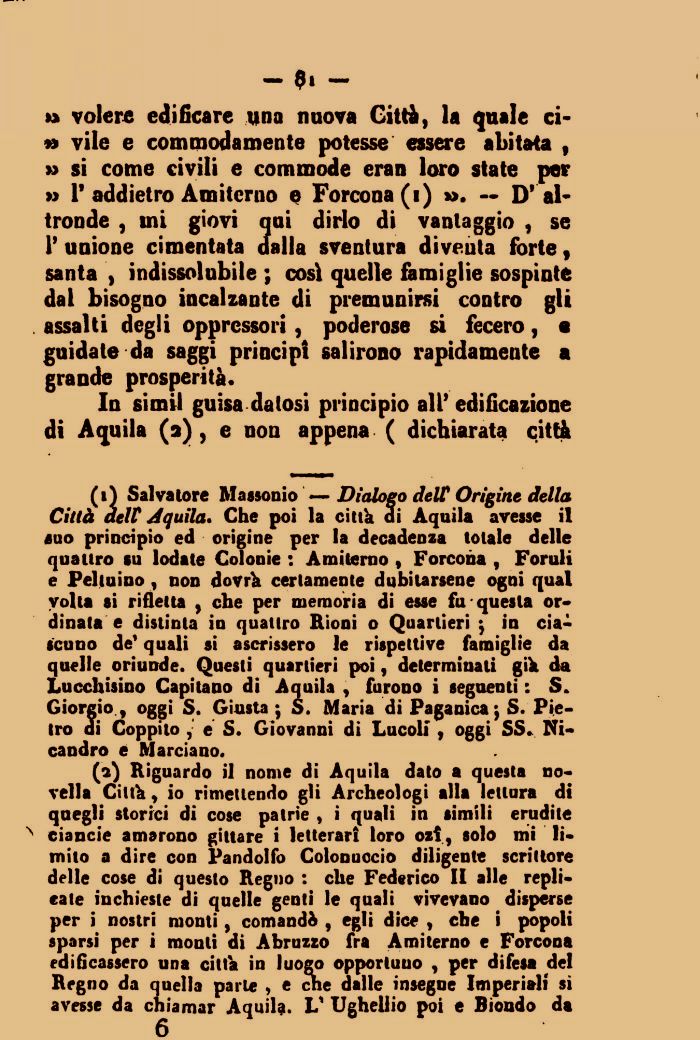 (1) Salvatore Massonio — Dialogo delt Origine della Città delt Aquila* Che poi la città ai Àquila avesse il «uo principio ed origine per la decadenza totale delle quattro su lodate Colonie : Amiterno , Forcona , Foruli e Peltuino, non dovrà certamente dubitarsene ogni qual volta si rifletta , che per memoria di esse fu questa ordinata e distinta in quattro Rioni o Quartieri ; in ciascuno de9 quali si ascrissero le rispettive famiglie da quelle oriunde. Questi quartieri poi, determinati già da Lucchisiuo Capitano di Aquila , furono i seguenti : S. Giorgio, oggi S. Giusta ; S. Maria di Paganica; S. Pietro di Coppito , e S. Giovanni di Lucoli , oggi SS» Ni-candro e Marciano.