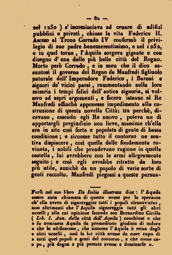 Forlì nel suo libro De Italia illustrala dice : V Aquila essere siala chiamata di questo nome per la speranza eh' ella aveva di signoreggiar tutti i popoli circonvicini, non altrimenti che l1 Aquila signoreggia tutti gli altri uccelli i alla cui opinione facendo eco Bernardino Cirillo ( Lib. /. Ann. della città delf Aquila ) conchiuse « che » fu nominala Aquila da premeditato giudizio di coloro » che la edificarono, che siccome l'Aquila è reina degli » altri uccelli , così la lor città avesse da esser capo di » tutti quei popoli e genti del contorno , e che come ca-» po, piU degna e più poteule avesse a dominarle ».