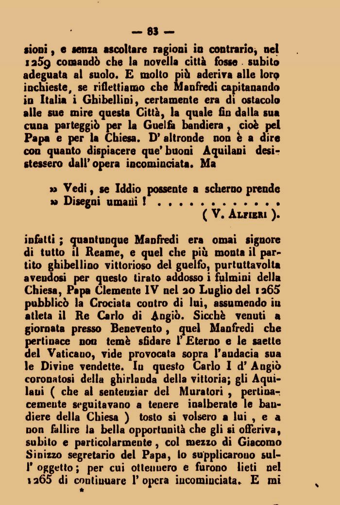sioni, e senza ascoltare ragioni io contrario, nel ia5g comandò che la novella città fosse subito adeguata al suolo. E molto piò aderiva alle loro inchieste, se riflettiamo che Manfredi capitanando iu Italia i Ghibellini, certamente era di ostacolo alle sue mire questa Città, la quale fin dalla sua cuna parteggiò per la Guelfa bandiera , cioè pel Papa e per la Chiesa. D' altronde non e a dire con quanto dispiacere que9 buoni Aquilani desistessero dall'opera incominciata. Ma